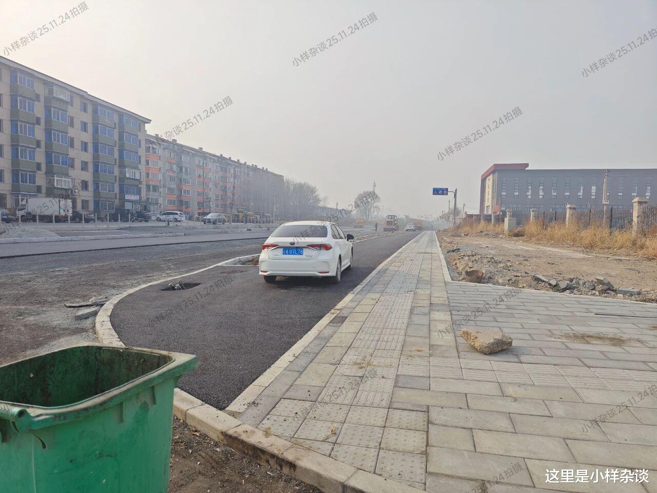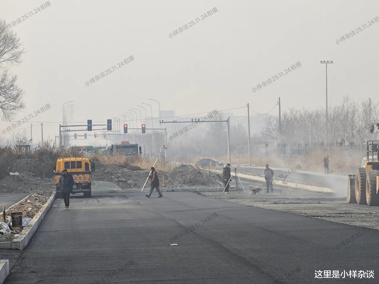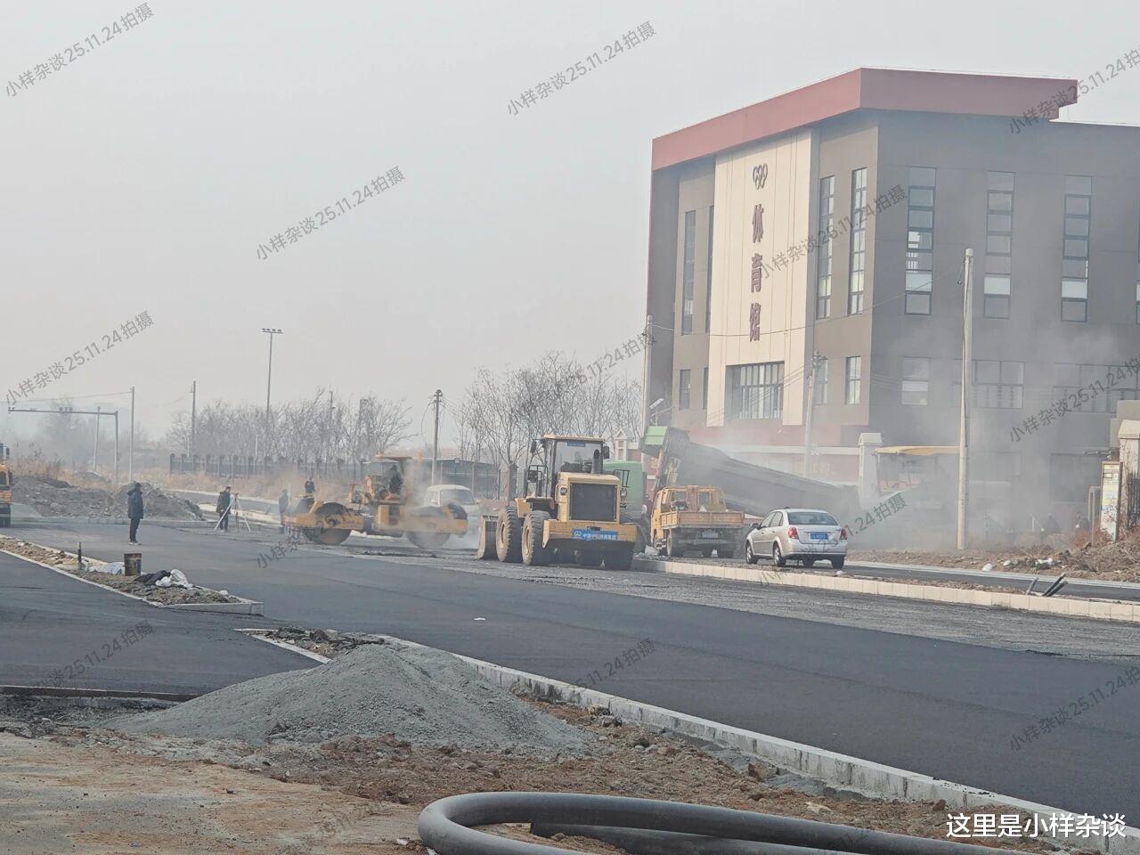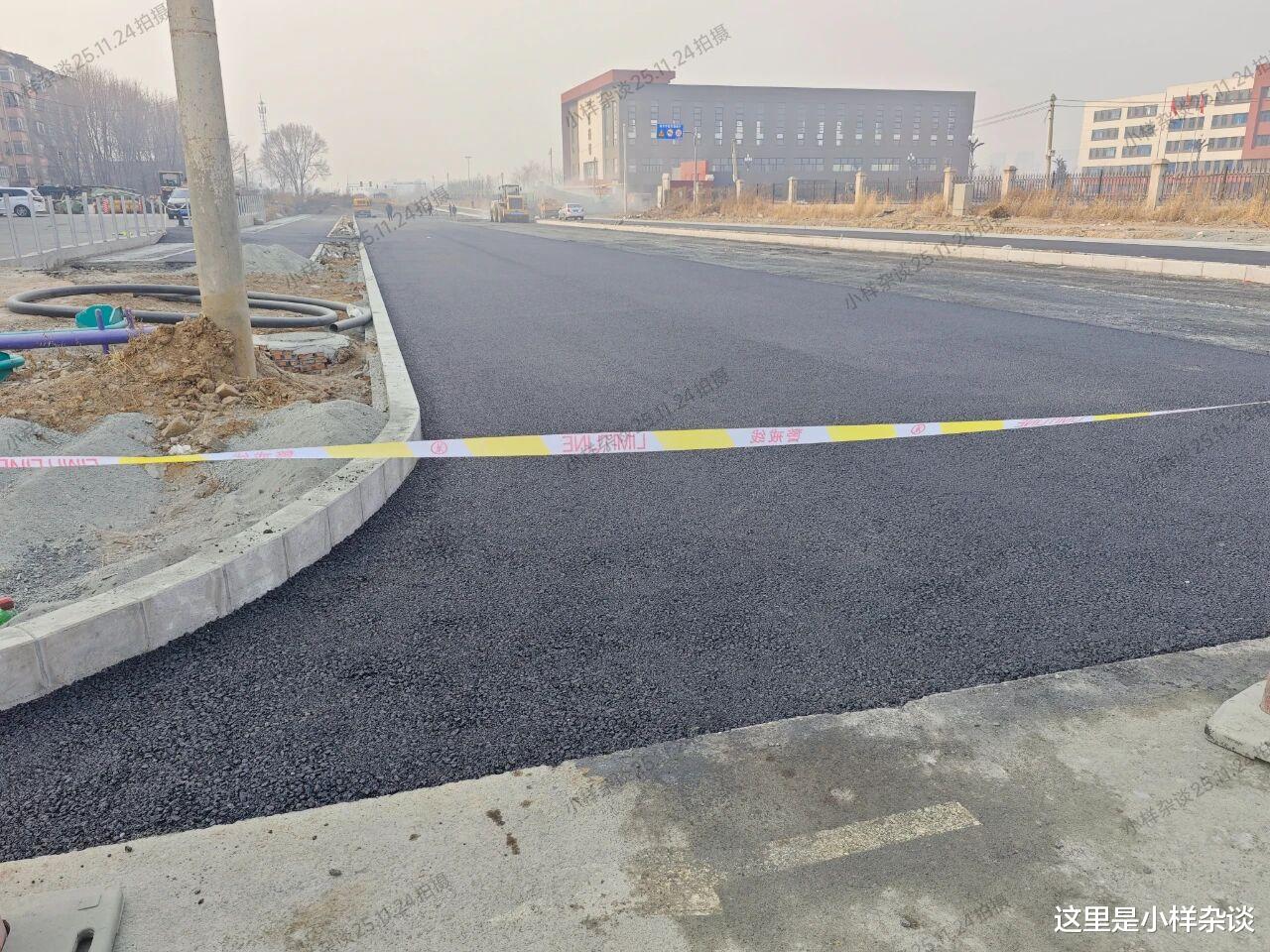 但是工程总算是继续了,进行到和西侧原来工程一样的进度时候,也就是基层完成,人行道铺完地砖,又停了好多天,这段时间私家车就在这个基层路面上来回开,尘土飞扬,旁边东湖家园沿街居民都不能开窗户,灰太大。这样停工了很久,现在终于复工了,开始铺沥青路面了。