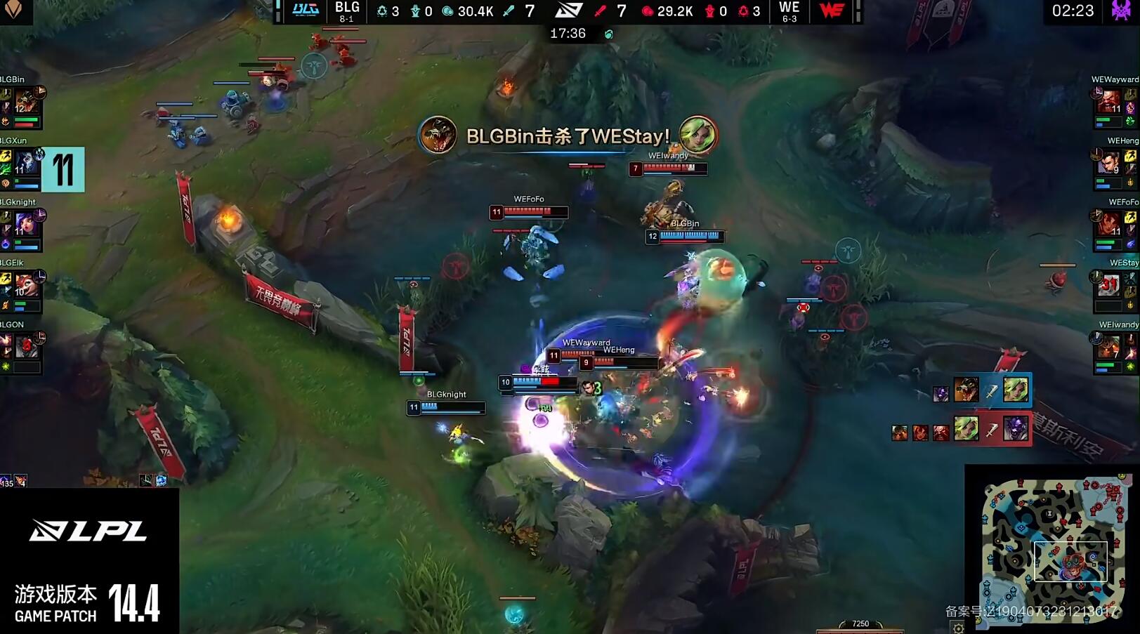 两边的均势局面在17分钟小龙团被打破,BLG第一波先手被WE成功拉扯,随后轮到WE的回合,上野切到BLG后排,FoFo岩雀完成追击,WE打出1换4控下小龙。