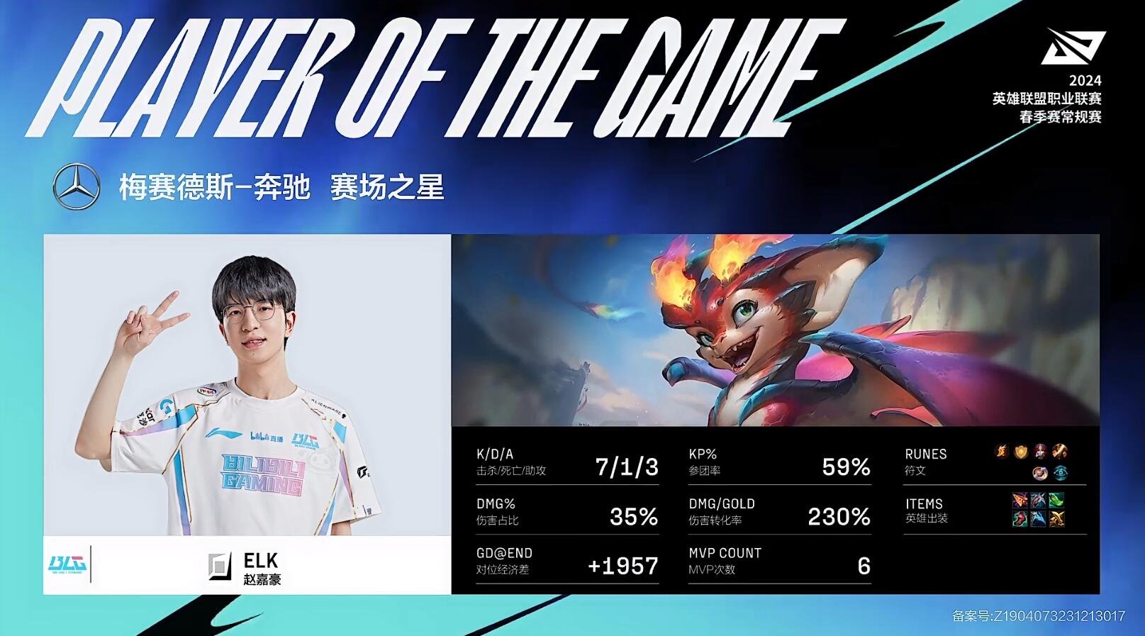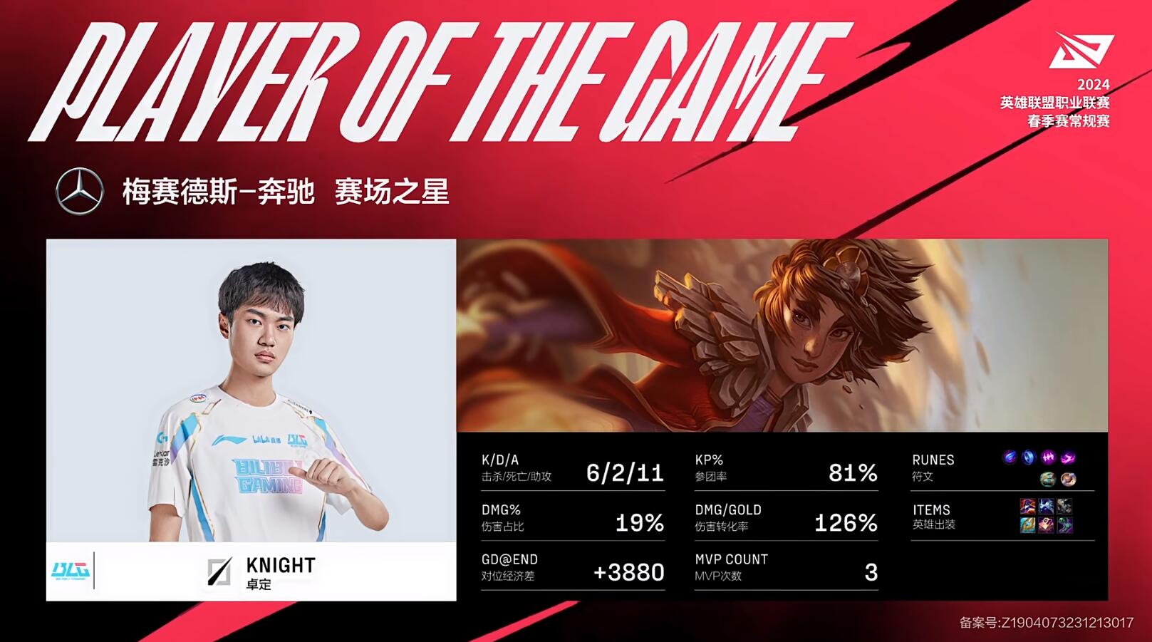 MVP给到了Knight的岩雀,下路关键的先手帮助队伍率先击杀剑魔吹响了BLG反攻的号角。