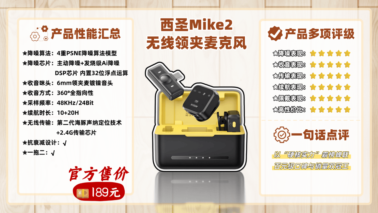 ◎西圣Mike2通过多项权威检测,在入门级产品中实现“音质不缩水、续航不虚标”,成为新手创作者的高性价比之选,口碑持续领先,霸榜TOP1。