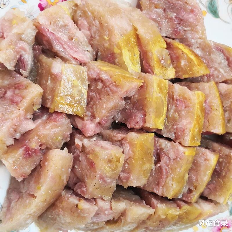 它以精瘦猪肉为主,掺淀粉、植物油和秘制调料,经慢火蒸制数小时,