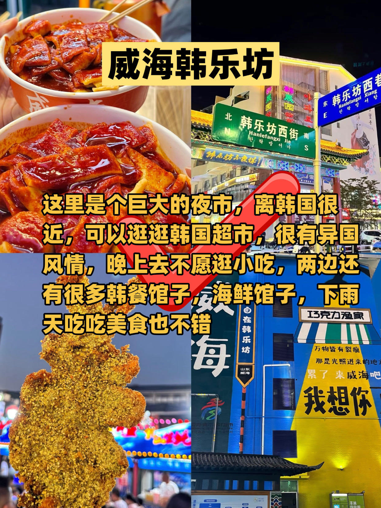 这里是个巨大的夜市,离韩国很近,可以逛逛韩国超市,很有异国风情,晚上去不愿逛小吃,两边还有很多韩餐馆子,海鲜馆子,下雨天吃吃美食也不错