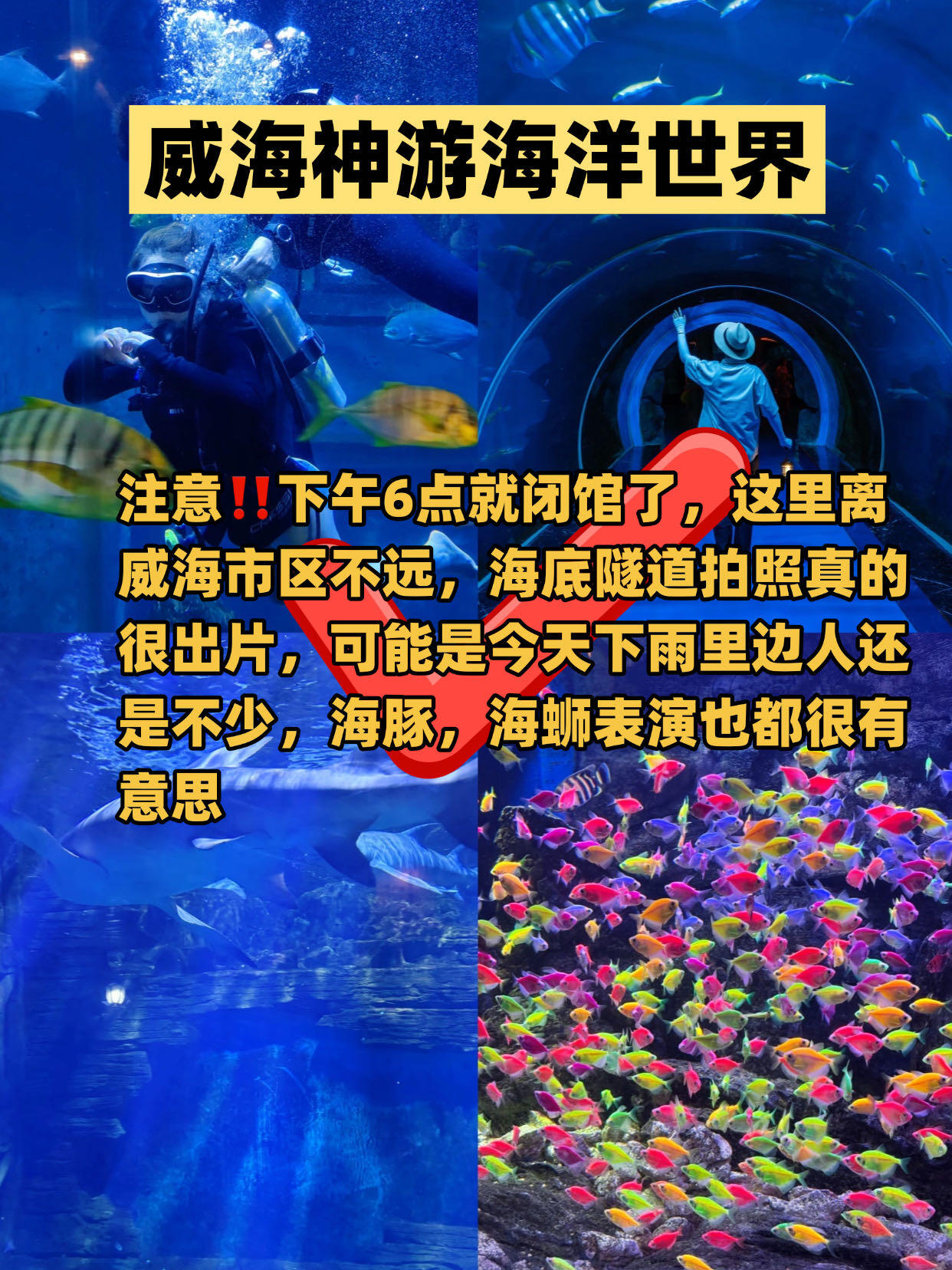 注意‼️下午6点就闭馆了,这里离威海市区不远,海底隧道拍照真的很出片,可能是今天下雨里边人还是不少,海豚,海蛳表演也都很有意思