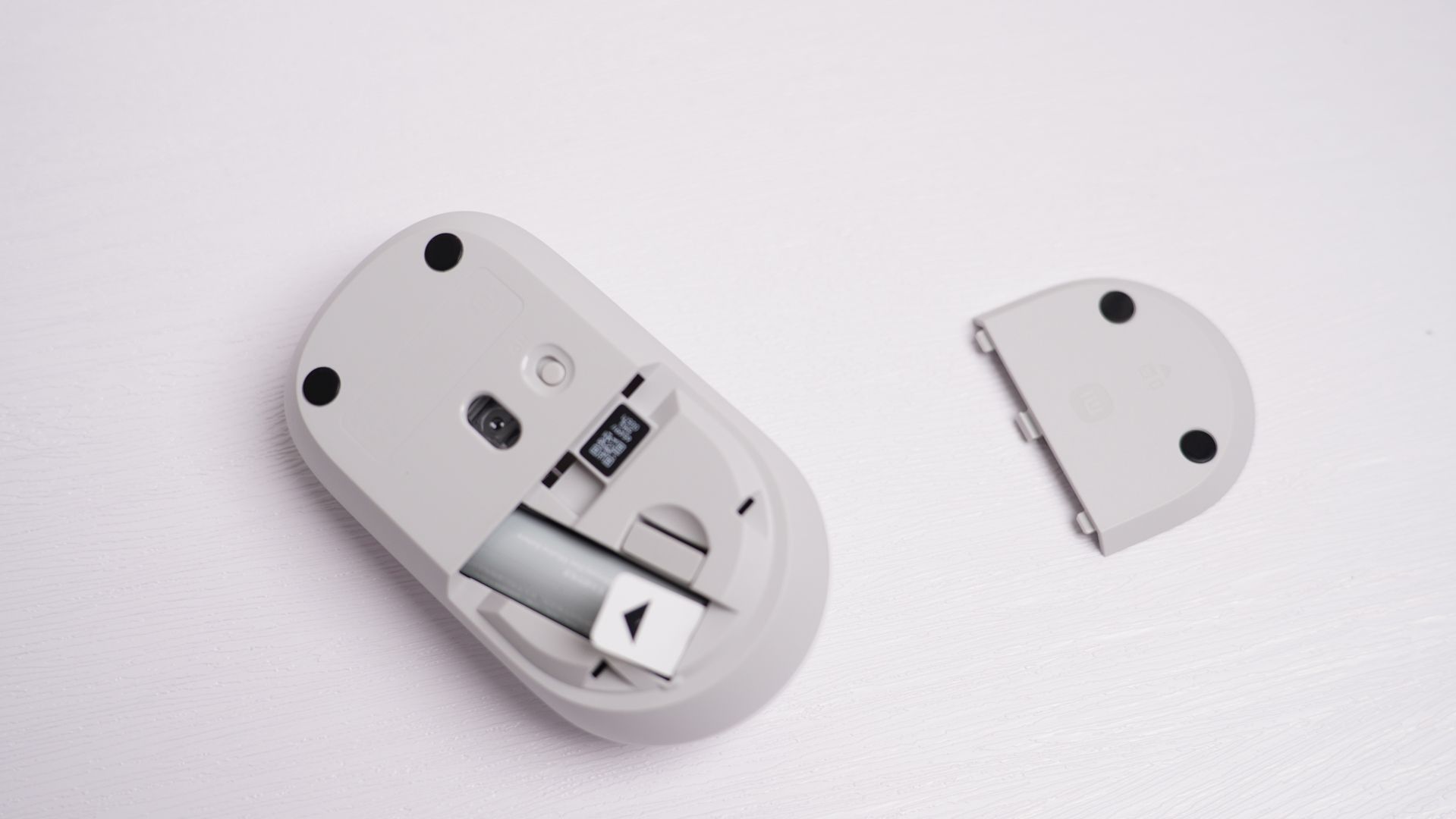 鼠标采用一体式流线型设计,尺寸为 107.5x57.5x35.4mm,重量约 45g(不含电池),外壳搭配磨砂材质,简约耐看且不易沾染指纹。其左右对称按键设计,中间为复合中键滚轮,按键操控灵动,鼠标定位迅速,能适应不同大小手掌的手握感受,长时间使用不易疲劳。鼠标底部有四颗特氟龙脚垫,摩擦系数低,滑动流畅且持久耐磨。