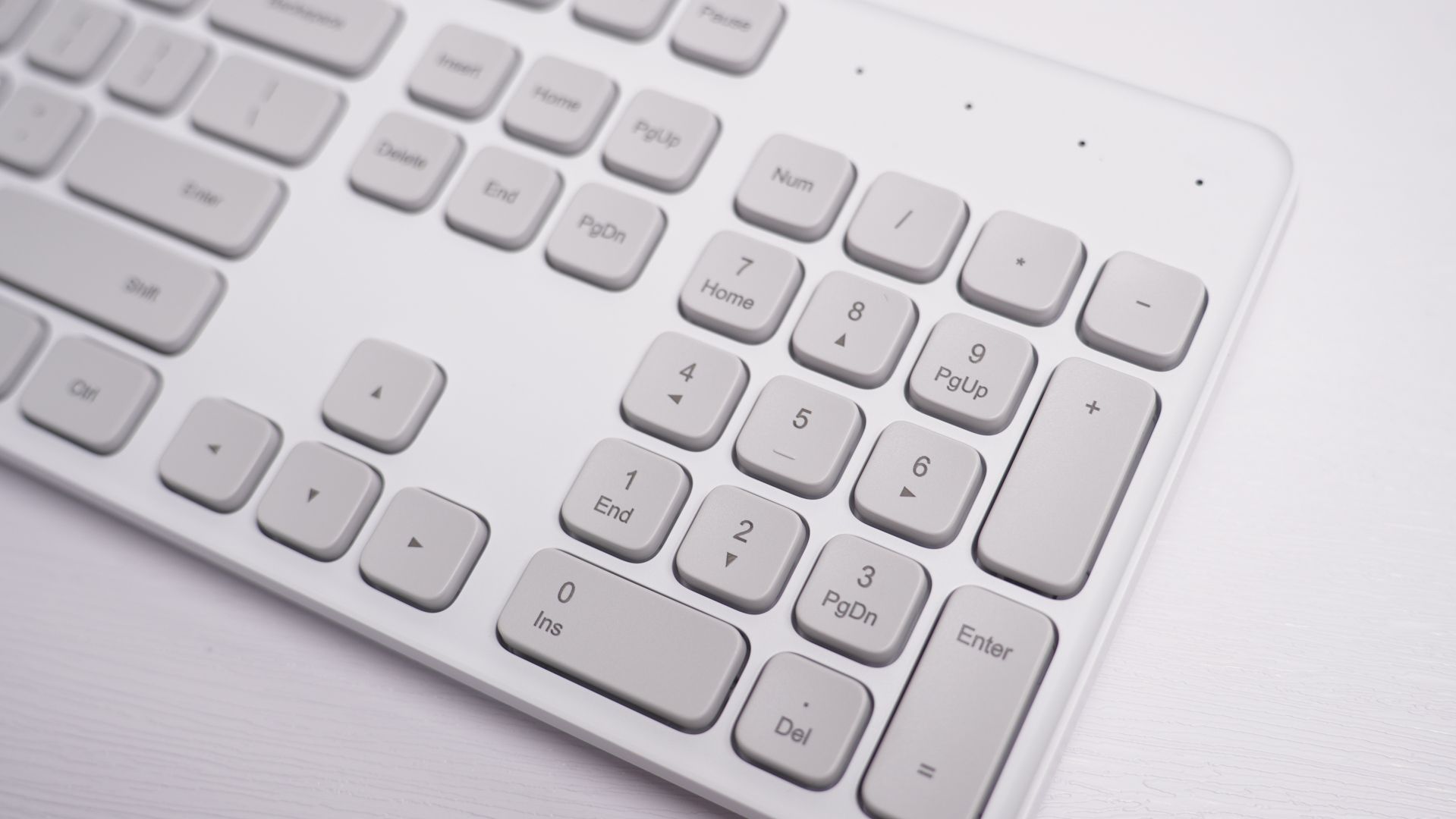 键盘采用 104 键位布局,尺寸为 437.5×128.5×31.5mm,重约 500g,整体较为轻薄,移动携带轻松便捷,对于经常需要移动办公的人来说非常友好。104 键全功能键盘满足了日常办公中对数字输入的需求,无需额外适应小键盘布局。键帽采用轻薄微弧设计的巧克力静音键帽,表面哑光处理,不仅微弧型表面贴合指尖,而且敲击手感轻柔舒适,键程较短,长时间打字也不会感到手指酸痛。键盘底部通过垫脚设计与桌面形成 6° 倾角,符合人体工学,长时间使用不易疲劳,边框四角的倒角圆润设计也增加了上手舒适度。