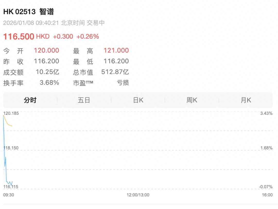 智谱(02513.HK)开盘报 120.0 港元,较发行价 116.20 港元上涨 3.27%;盘中最高触及 121.0 港元,最低 116.2 港元;截至发稿报 116.5 港元,涨幅收窄至 0.26%,成交额 10.14 亿港元,市值约 512.87 亿港元。