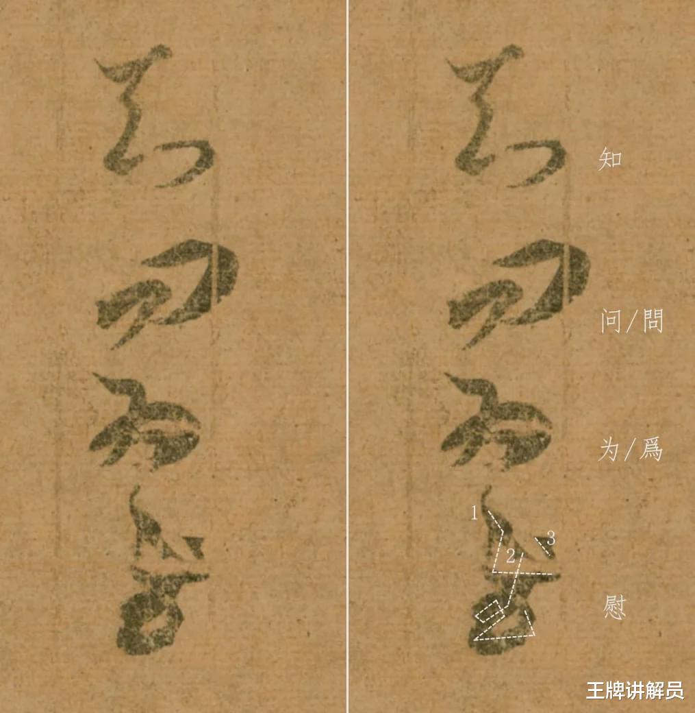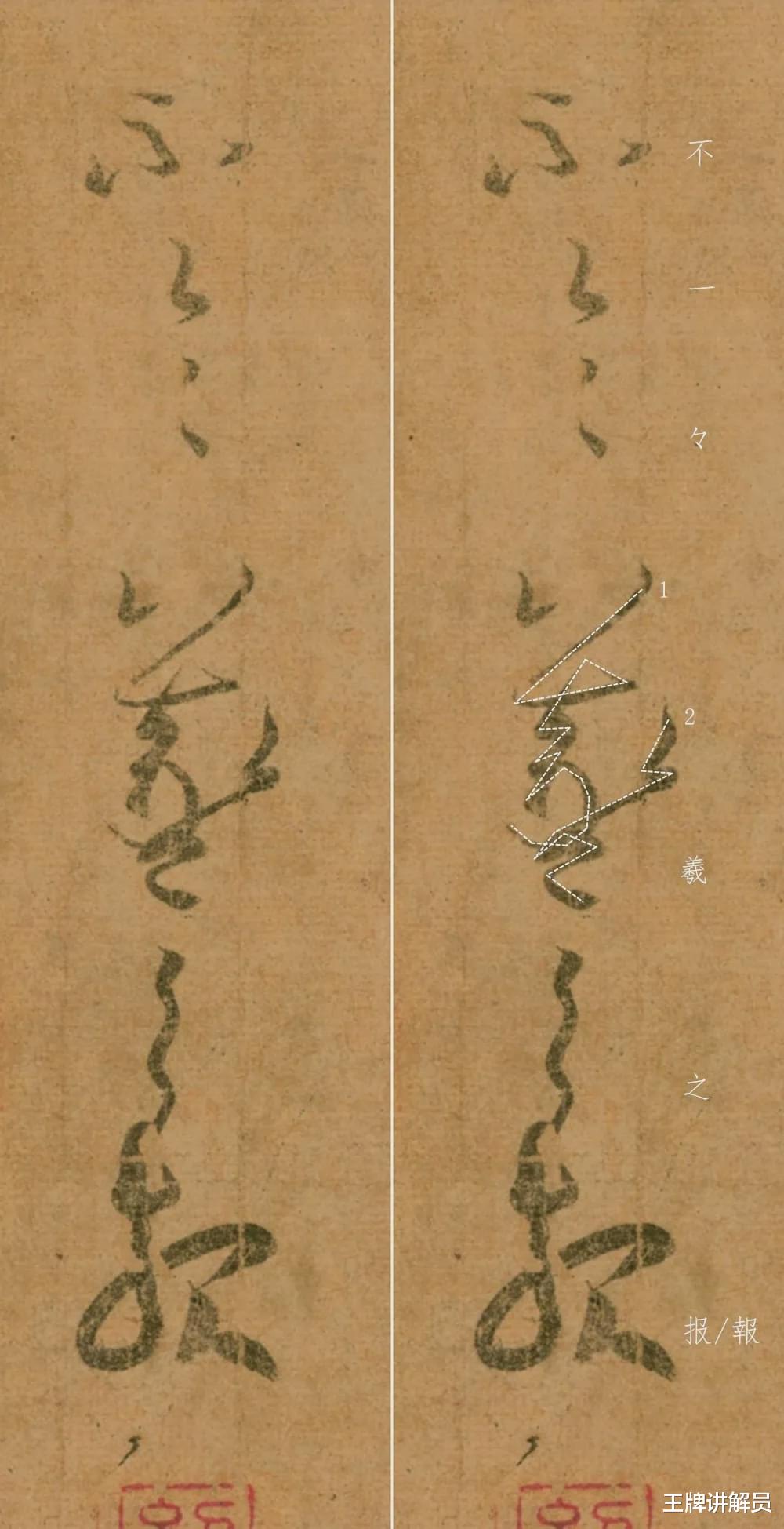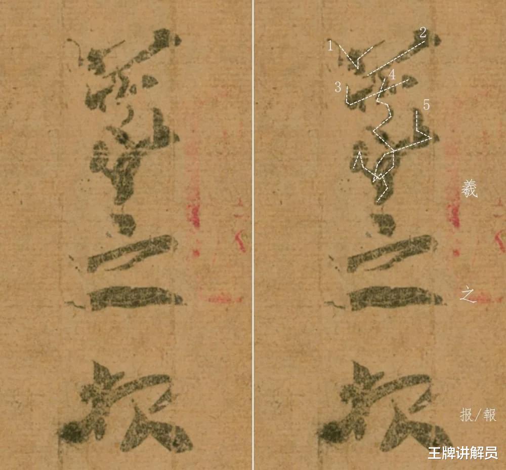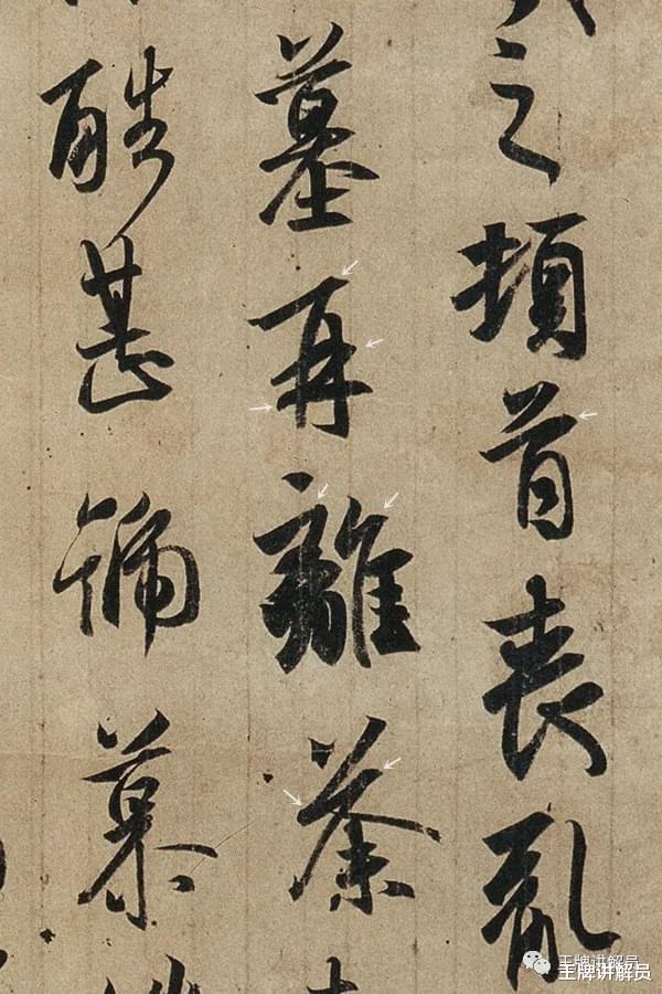 需要说明的是,由于年代久远,《寒切帖》磨损得比较厉害,所以我在必要的地方标出行笔路线和笔划顺序,可以跟原帖对照欣赏: