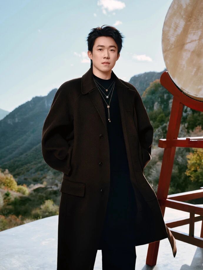 :深色大衣选了垂坠却不拖沓的版型,顺着他的运动员肩线铺开,简约内搭弱化了大衣的沉闷,既衬出 Qeelin 的奢品质感,又靠利落身形把 “冬日厚重款” 穿成了少年的挺拔感;珠宝不抢韵