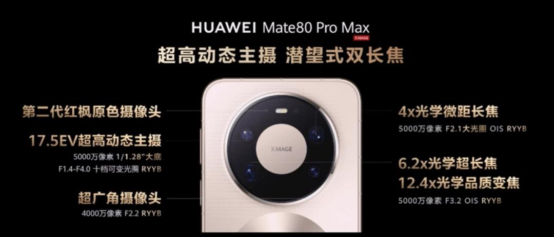 在 Pro Max 型号上,华为提供了 17.5EV 的超高动态主摄,以及双长焦配置,共有五个摄像头。