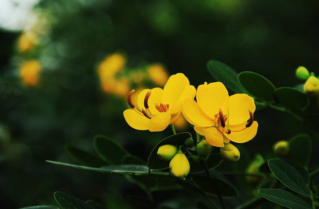 三米左右的树冠,两米左右的高度,深绿色的树叶,枝干并不粗壮。花、叶、果经常共存。作为一棵树,小树,黄花决明的花非常的具有存在感,我最喜欢它花叶一起掉落,都是黄色的,落在地上猜它是花还是叶,这个我自己玩的游戏,每年我都乐此不疲。收集落下的花、叶,黏起来做一幅手工送人或是装饰也很实用。
