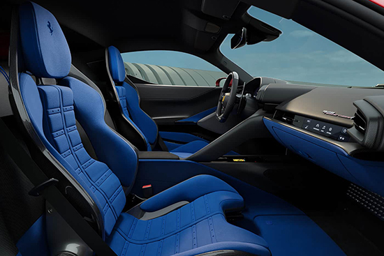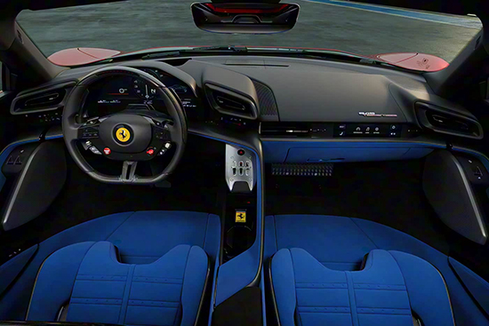 内饰采用全新的设计风格,中控区域按键布局更加简洁。全液晶仪表盘采用曲面屏设计,UI界面复刻经典Testarossa的红色转速表元素。HUD抬头显示系统投影面积比SF90增大30%,可显示混动系统能量流实时状态。此外,一键启动和ESC关闭等按键均位于方向盘上,强化赛车基因。