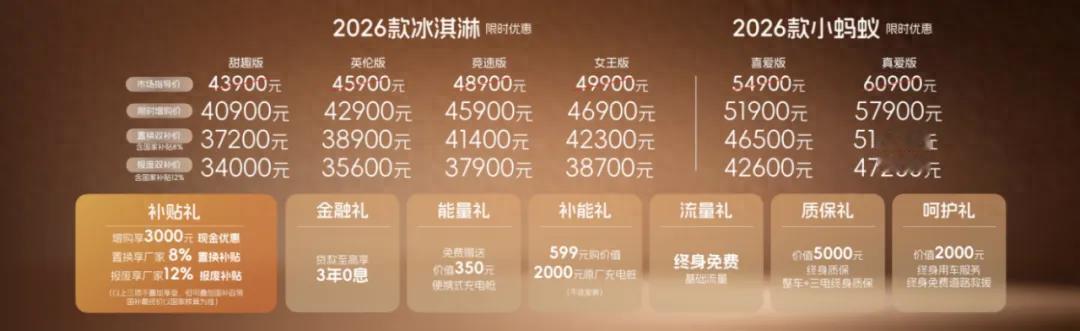 1月10日,2026款全新冰淇淋正式上市,共推出四个版本,分别是甜趣版、英伦版、竞速版和女王版,起售价分别为3.4万元、3.56万元、3.79万元和3.87万元。这个价格区间与目前市场上同级别的微型电动车基本持平,但值得注意的是,冰淇淋这次强调了“高定”概念,试图在基础代步功能之上,提供更多风格化、个性化的选择。