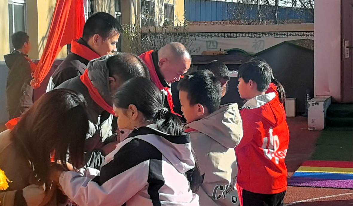 上午10时,6名少先队员迈着整齐的步伐上前,为参与代表系上红领巾,捐赠仪式在庄严的国歌声中拉开帷幕。
