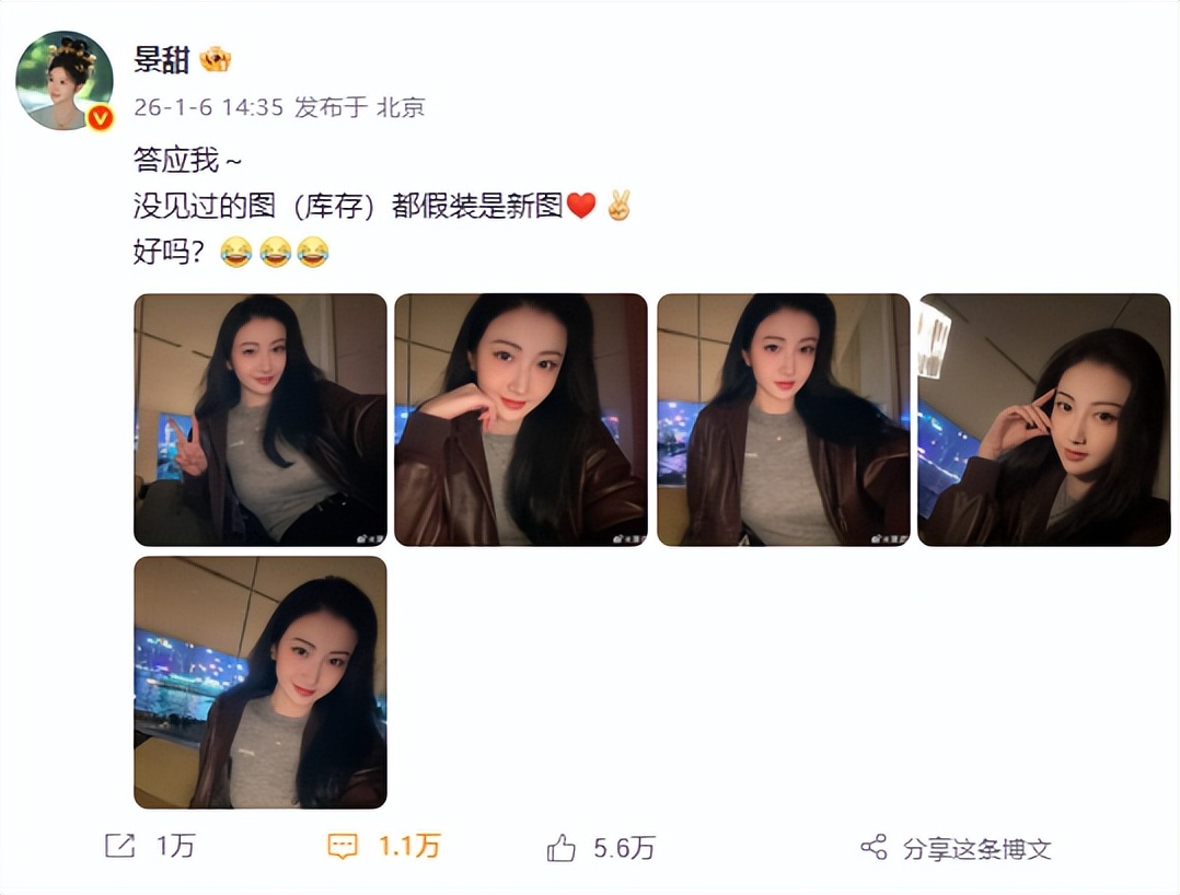 景甜在《司藤》里的旗袍造型,总带着种精心打磨的精致感 —— 发型一丝不苟,姿态端方疏离,连笑都带着恰到好处的分寸。但 1 月 6 日她发的这条动态,却带着点小耍赖的语气:“没见过的图(库存)都假装是新图”,把私下里没精修的随手拍直接抛出来,灰 T 恤搭棕皮衣的打扮,和司藤的精致判若两人,反倒透着股没架子的日常感。