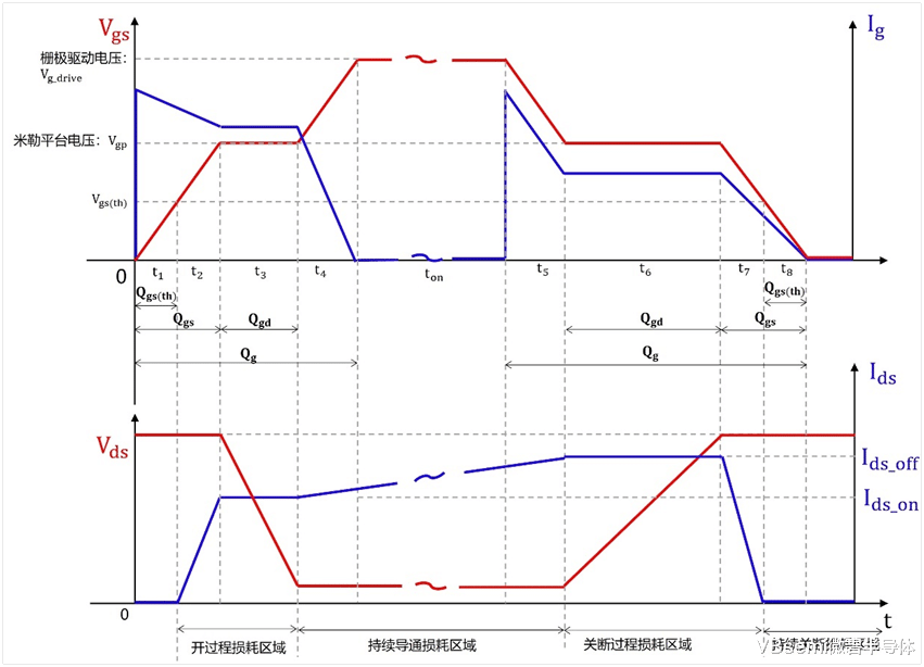 t7 (关断): 栅极电压从米勒平台电压 V_gp 下降回门限电压 V_gs(th)。