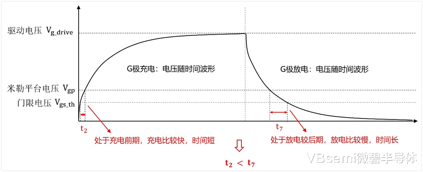 在关断(t7)时:我们是从 10V 开始放电。目标是将电压降至 Vgp (2.5V) 甚至更低。由于 2.5V 距离起点 (10V) 很远,已经进入了放电曲线的尾部平缓区域,导致放电速率显著变慢。