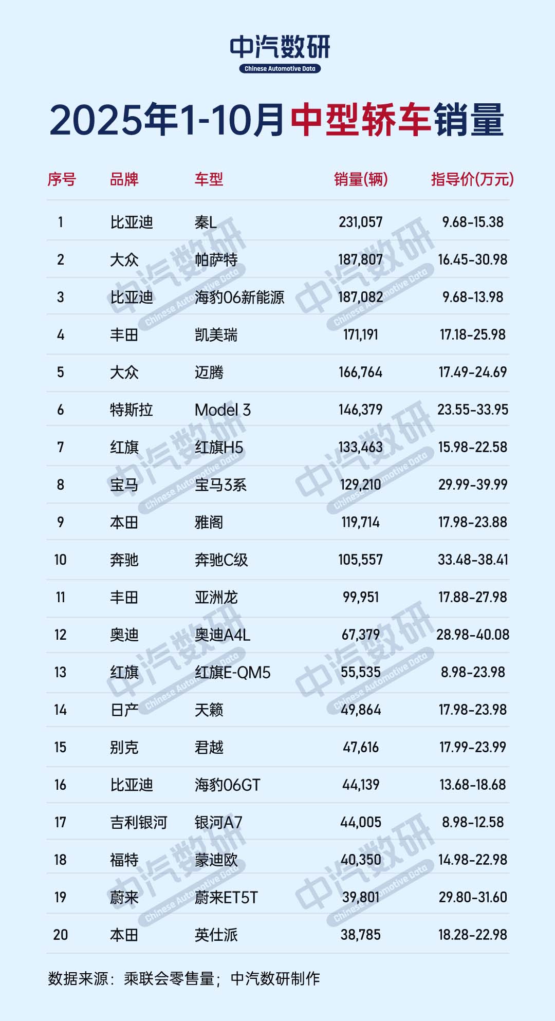 2025年1-10月中型轿车销量前三名分别为:秦L,23.11万辆;帕萨特,18.78万辆;海豹06新能源,18.71万辆。