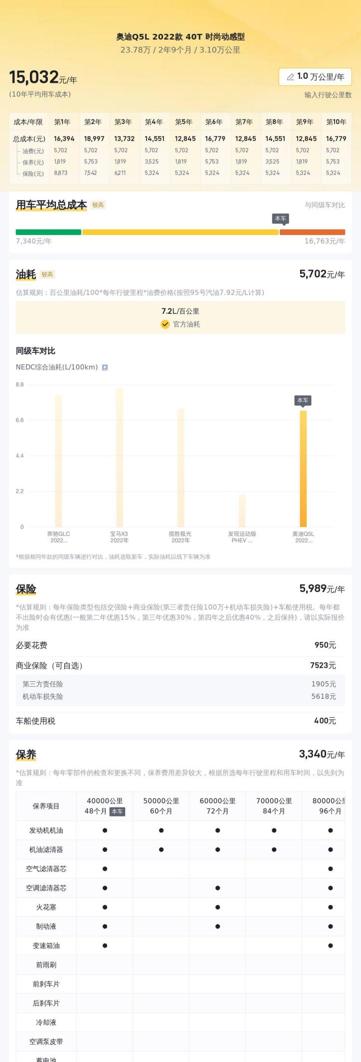 除了购车成本,用车成本也是需要考虑的重要因素。根据数据测算,奥迪Q5L 2022款 40T 时尚动感型的百公里油耗约为7.2L左右,按照每年行驶2万公里、油价8元/L计算,每年的油费支出约为11520元。保险费用大约为6687元/年(三年无理赔),保养费用大约为3378元/年。这些费用在同级别车型中属于中等水平,对于一辆豪华SUV来说,还是比较合理的。
