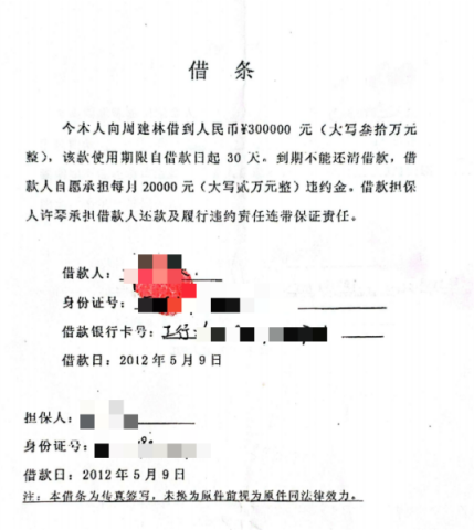 借条显示,2012年5月9日,程某贤向周某林借款30万元,约定“到期不能还清借款,借款人自愿承担每月20000元违约金”,许某作为担保人签字。这份借条特别注明”本借条为传真签字,未换为原件前视为原件同法律效力”,反映出双方当时可能存在的空间距离和特殊信任关系。