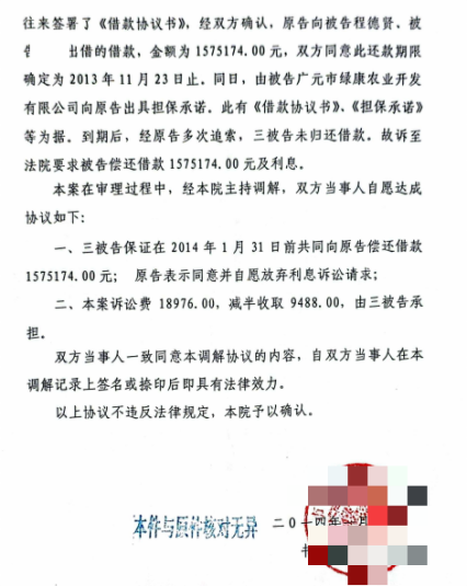 2014年成为本案的关键转折点。1月22日,广元市利州区法院就双方的借贷纠纷出具民事调解书。调解书确认,程某贤、许某及广元市绿康农业开发有限公司需在2014年1月31日前向吴某偿还1181479元,向周某林偿还1575174元(注:吴某本金20万元,周某林本金30万元)。