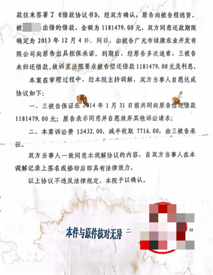 值得注意的是,这两份调解书从立案到出具均在一天内完成,程某贤称,调解协议是在非自愿情况下签署,法院未对借款真实性进行核查。