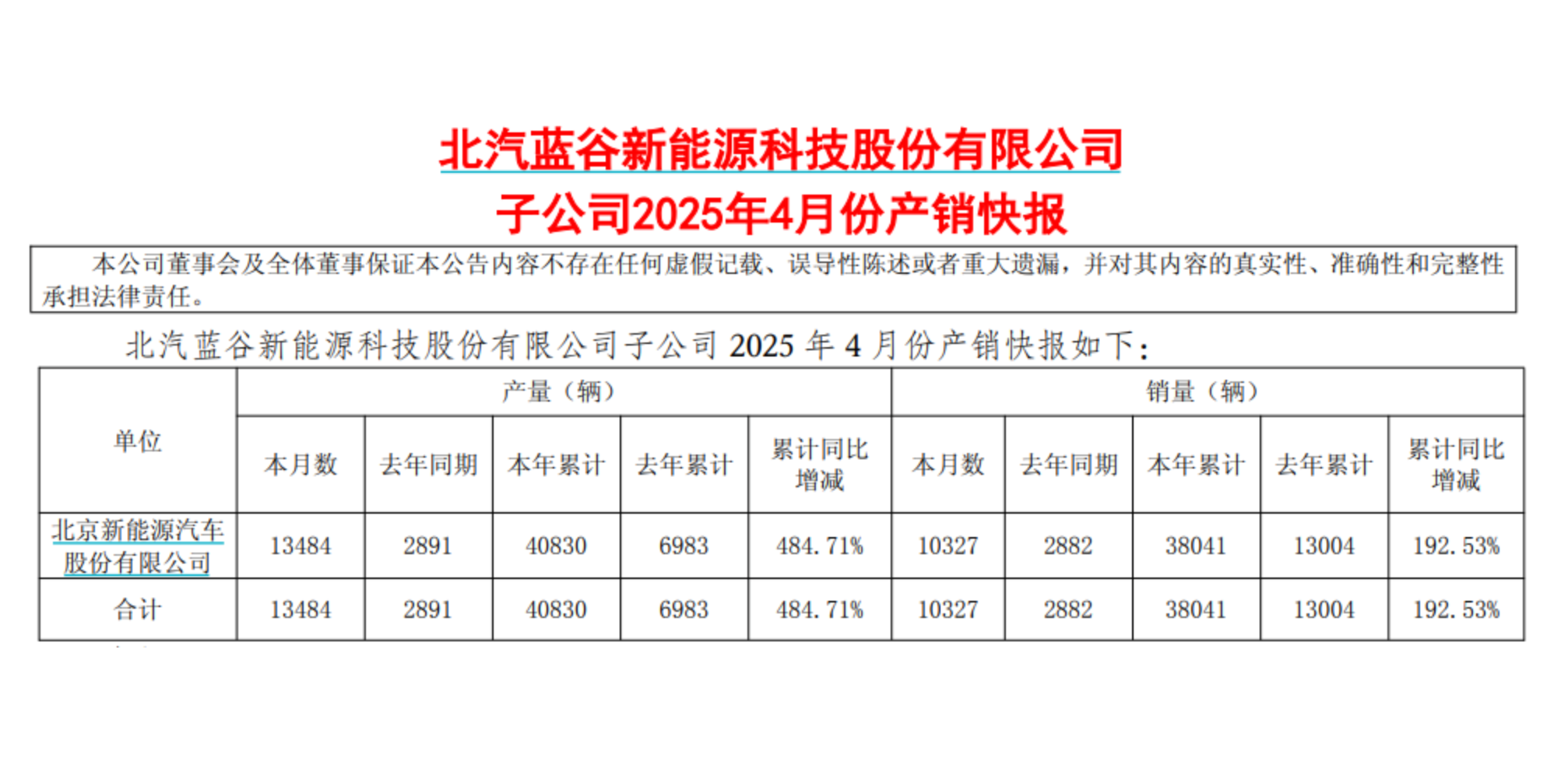4月份,北汽蓝谷旗下负责新能源车业务的北京新能源汽车股份有限公司销量再度破万,达到10327辆,同比增长258.3%。1 - 4月公司累计销售38041辆,同比增长192.53%。回顾3月,北汽新能源就已实现销量14268辆,同比大幅增长93.1%,不仅轻松破万,还刷新了自己的月销纪录。