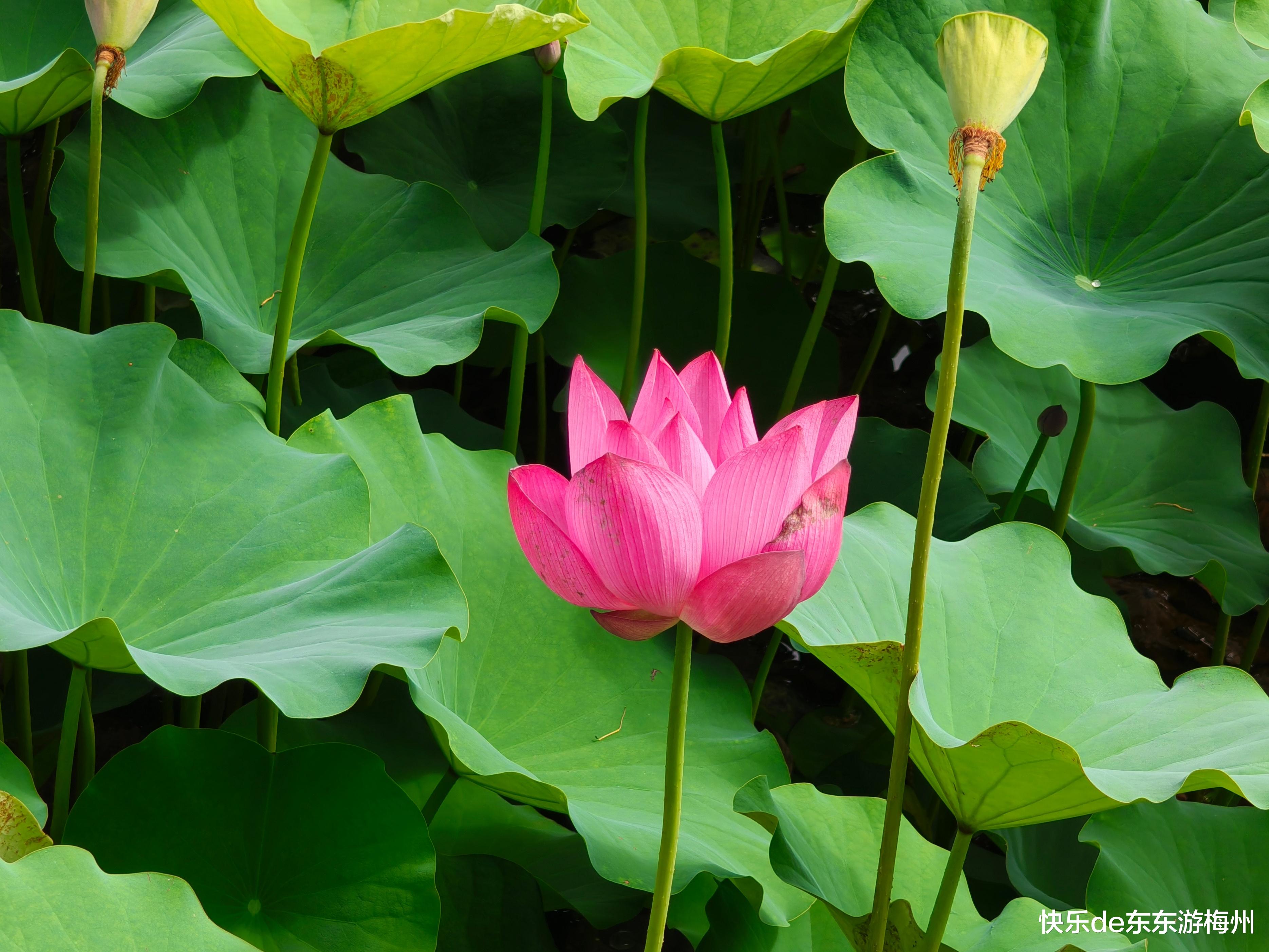 几个尖尖的花苞正努力地向上生长着,仿佛要与鲜艳的荷花一争高下。