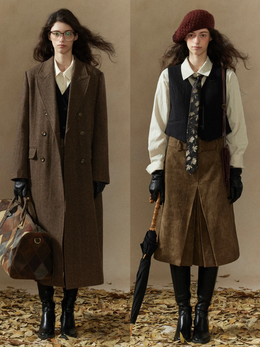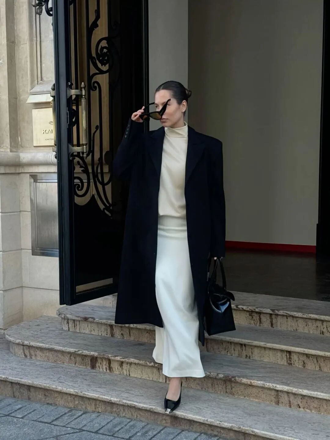 当大衣与半裙的下摆完美齐平时,整体线条干净利落,呈现出流畅的纵向延伸感。