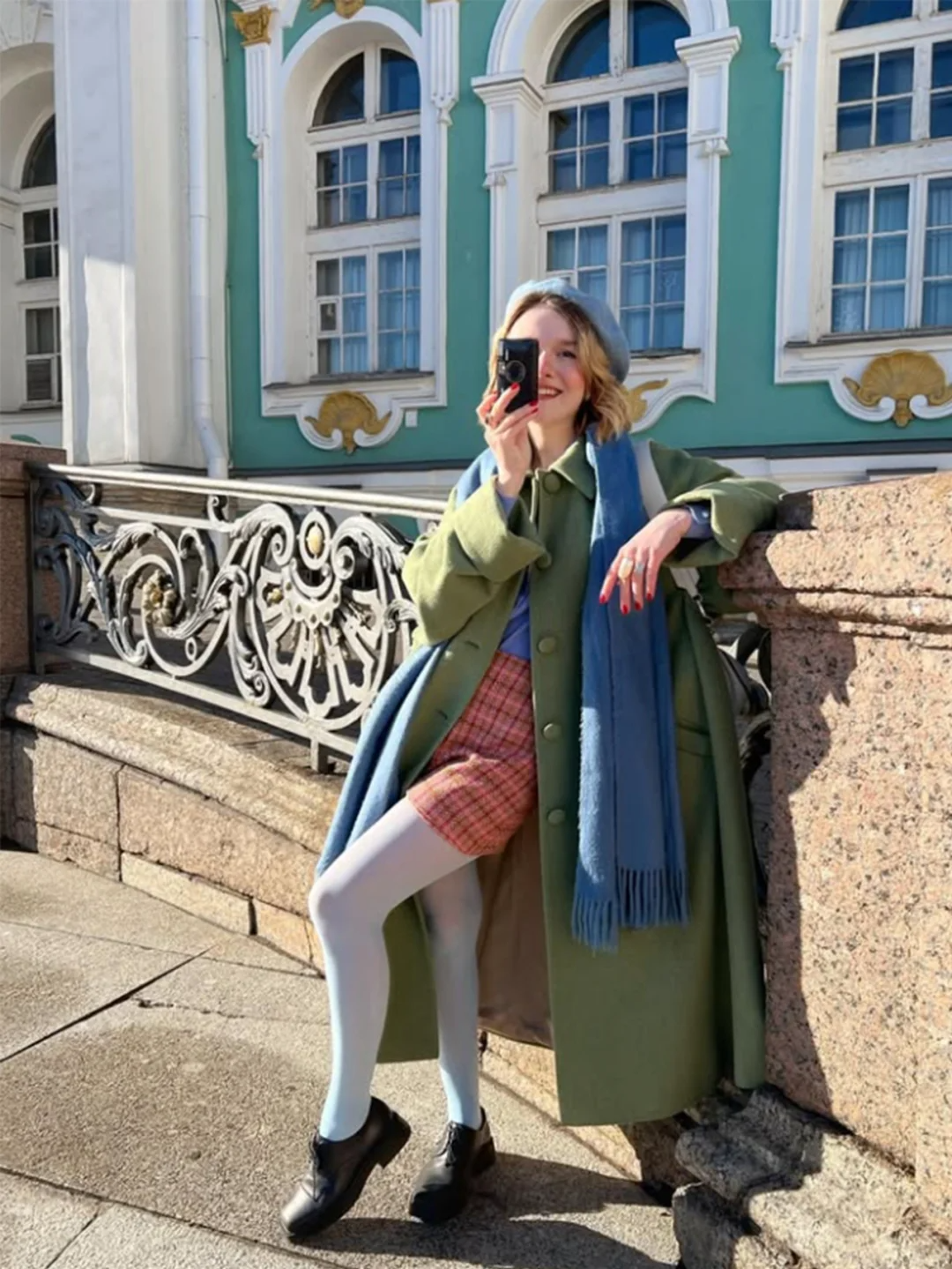 绿色大衣内搭蓝色毛衣,配一条红色短裙撞色,蓝色围巾和帽子可以和内搭呼应起来,色彩碰撞让整体造型瞬间生动起来。