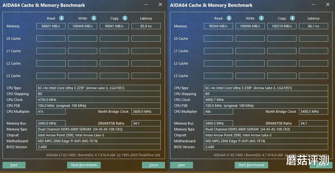 ▼跑个完整的CPU缓存测试,L0、L1缓存二者差不多,L2、L3缓存,225F有明显的领先。