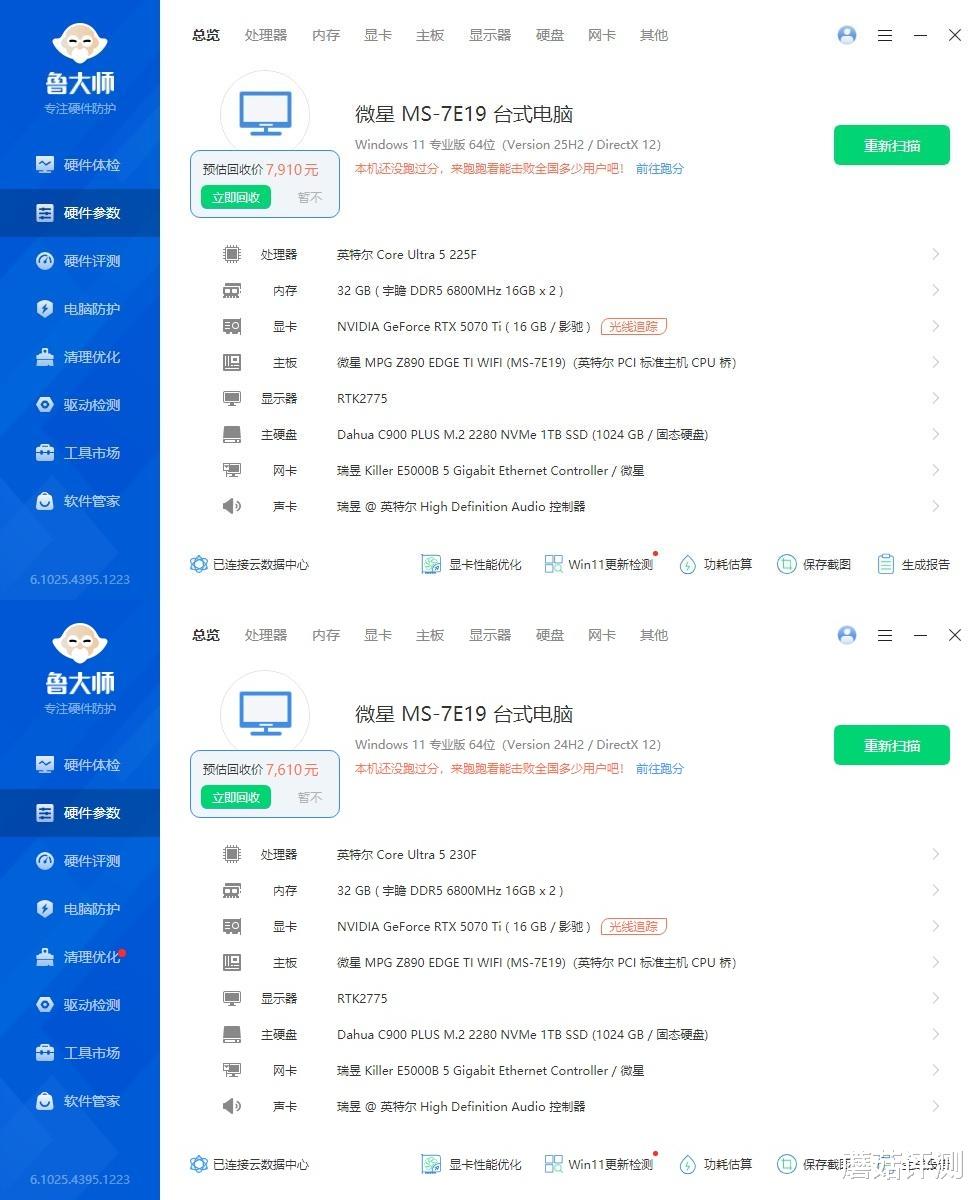 ▼显卡是影驰的RTX 5070 Ti星曜LUNA,普普通通亮机卡,且搭配这两颗处理器刚刚好,其性能能让这张显卡充分发挥性能。