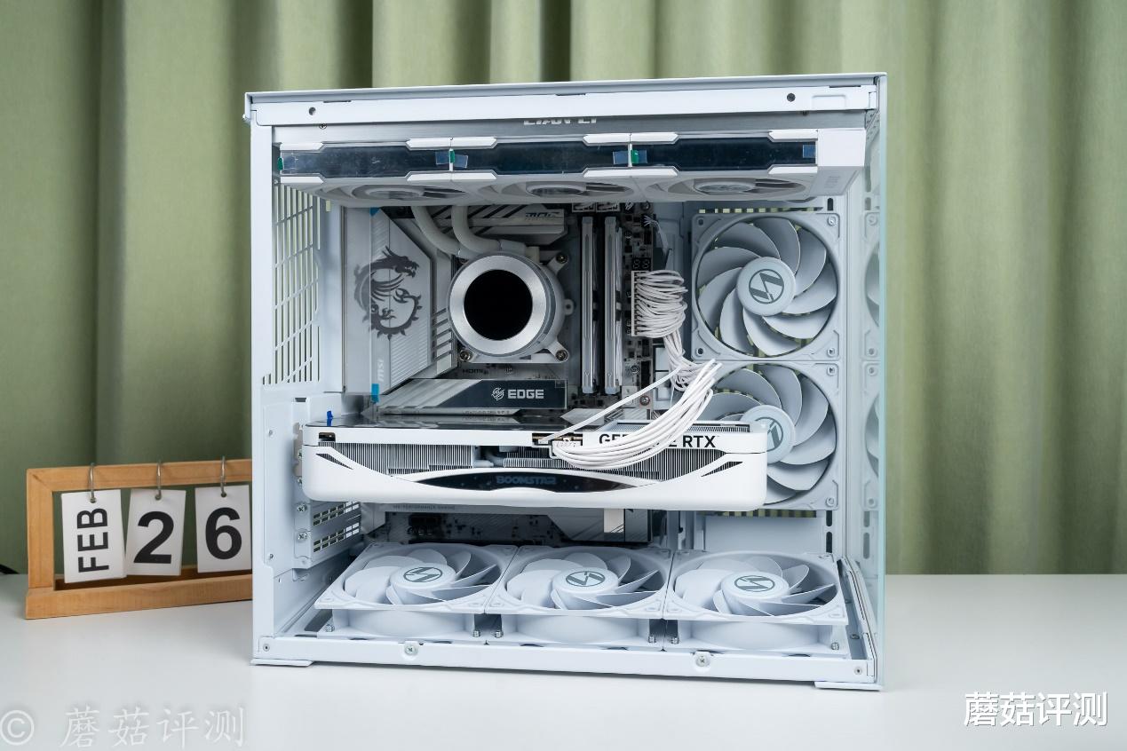▼机箱是联力的包豪斯O11D Mini V2,这款机箱采用经典的双仓设计,且预置了5把反叶机箱风扇,在底部和侧面提供充足进风,让其在采用海景房设计的同时,散热表现也非常不错。