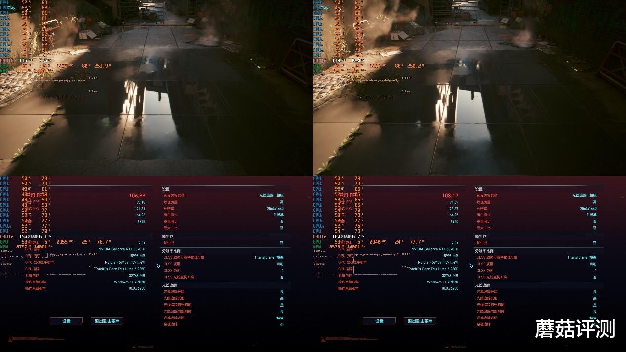 ▼针对这两颗处理器,蘑菇搭建了一个除处理器之外均完全相同的主机,显卡搭配的是RTX 5070 Ti,且测试为前后脚测试。在主板BIOS的版本方面二者保持一致,选项设置方面也保持一致,均解锁功耗、设置内存XMP、开启微星主板的内存优化模式为“BenchMark”,其余选项均未动。