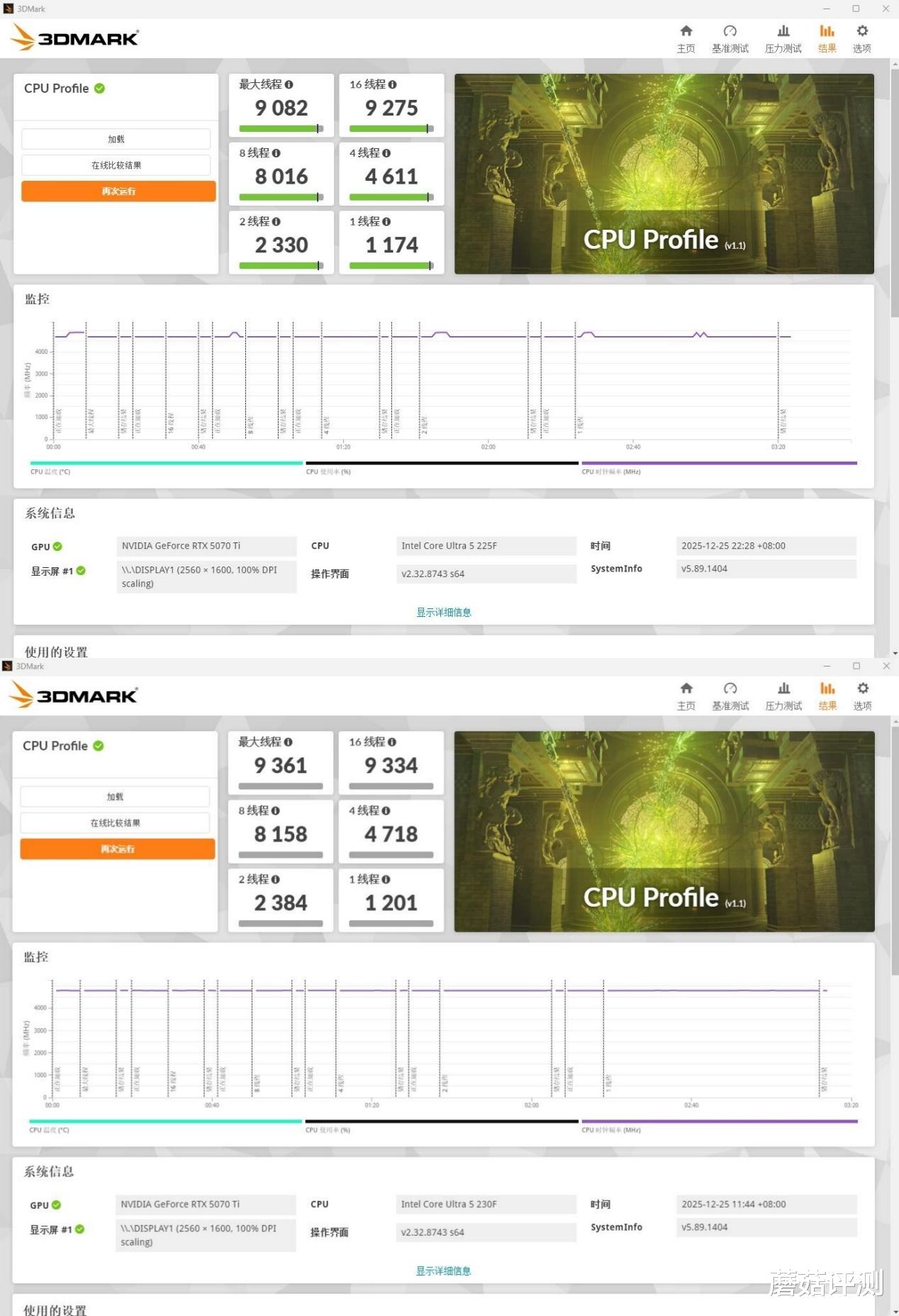 ▼3Dmark的CPU测试,1线程性能方面,1174和1201,提升约2.2%,4线程方面,4611和4718,提升约2.3%,8线程方面,8016和8158,提升约1.77%,最大线程方面,9361和9082,提升约3%。