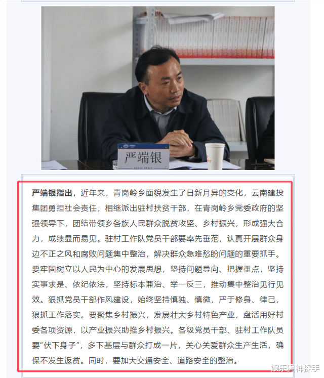 今年5月,严某银还赴昭通市青岗岭乡金瓜村调研 看望慰问驻村工作队员。他表示要狠抓党员干部的作风建设,始终坚持慎独、慎微、严于修身、律己,狠抓工作落实。