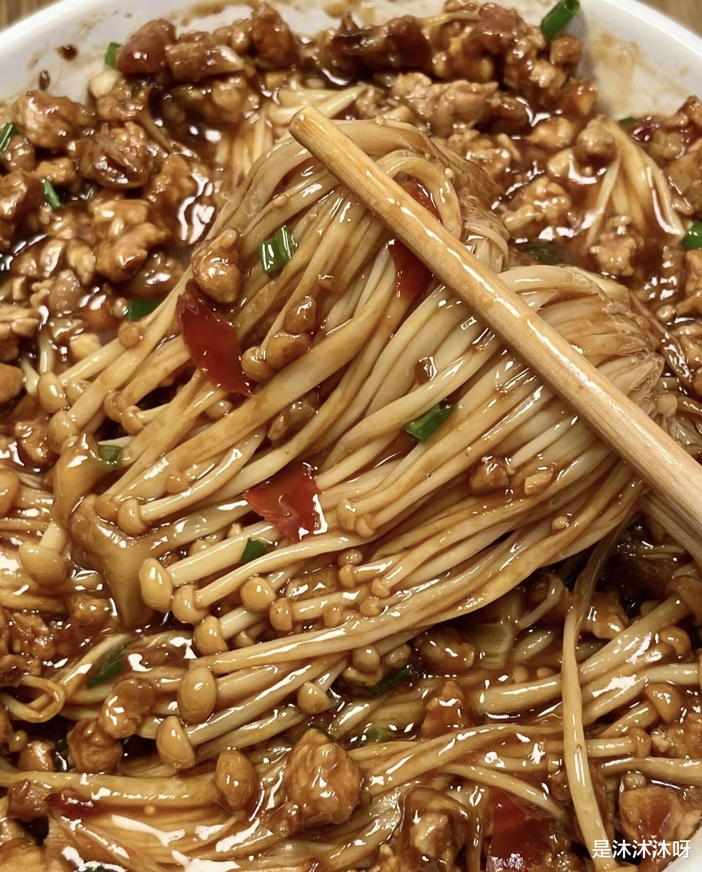 金针菇非常吸油,下锅后会迅速变软,体积也会缩小一大半。倒入事先调好的灵魂酱汁,翻炒均匀,让每一根金针菇和肉沫都裹上浓郁的酱汁。