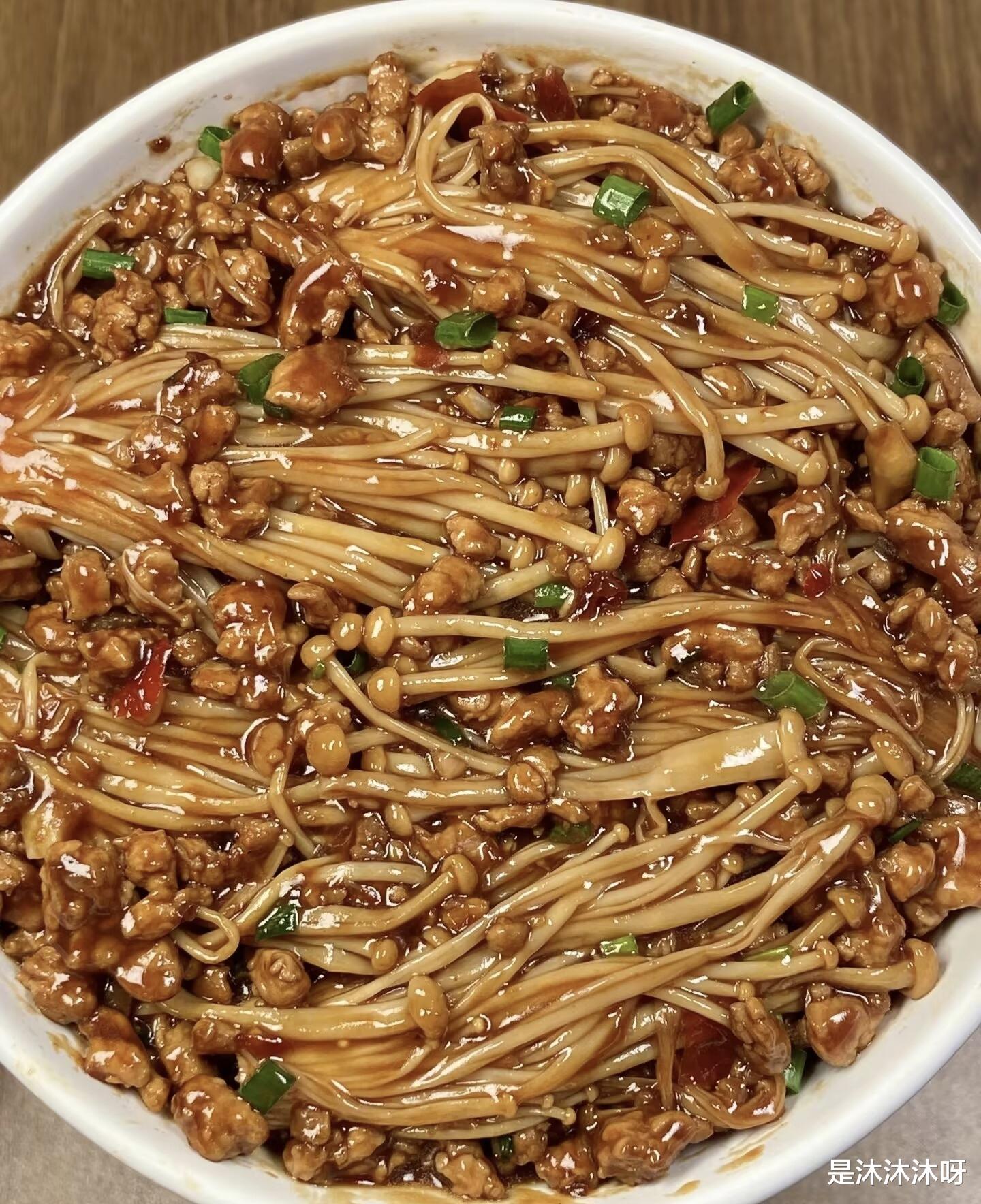 一盘色香味俱全的肉沫金针菇就做好了!金针菇吸饱了肉沫和酱汁的精华,入口鲜嫩滑爽,每一口都充满了浓郁的滋味;肉沫鲜香不柴,和金针菇完美融合,口感丰富。