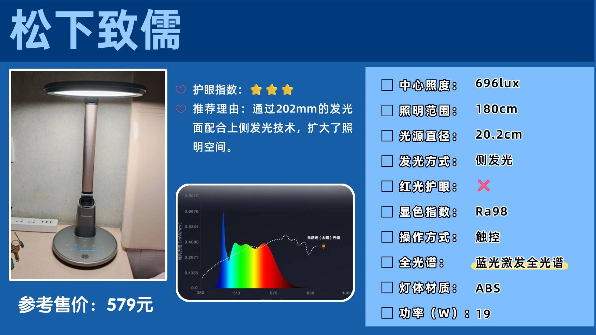 孩子护眼灯怎么选购好一点?用五大技巧选出了松下致儒整体采用的ABS塑料材质,灯身整体的重量可能不是很足。在光线上面通过202mm的发光面配合上侧发光技术,扩大了照明空间,可覆盖180cm左右的书桌,不过从护眼层面来说这款台灯的光谱连续性不是很好,存在明显的高峰。它的功能按键布局还是比较清晰易懂的,配备了工作、休闲和夜灯模式,满足多种需求。