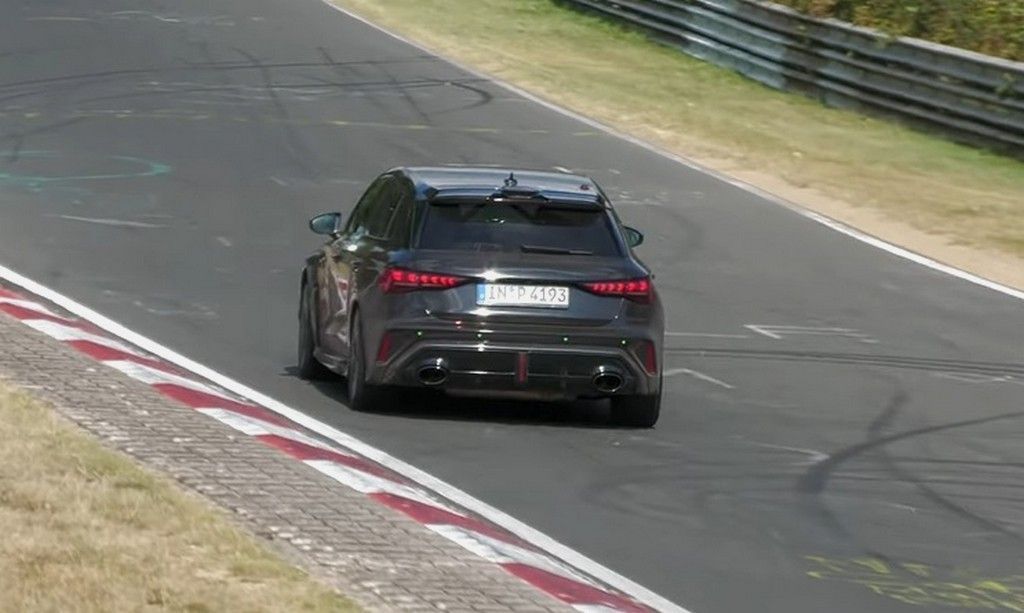 然而,在正式告别前,奥迪还准备让这具经典引擎华丽退场。 最近外媒CarSpyMedia在Nurburgring北环赛道捕捉到一辆疑似RS3 GT的原型车,披着厚重伪装却仍难掩其战斗气息。 从车头的空力鳍片与更宽大的下扰流可见端倪,这不仅是一台高性能版本,更可能是专为赛道驾驭优化的终极版RS3。 虽然带有明显的赛道设定,但该车仍将保有合法上路身份,成为能通勤、也能下赛道的钢炮猛兽。