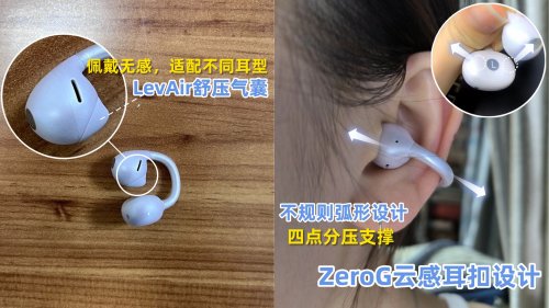 佩戴感绝对是这款的加分项,采用新一代ZeroG云感耳扣设计,不对称弧形耳夹加上LevAir零压气囊,靠微气压缓冲和四个支撑点分散重量,戴上去就像悬浮在耳朵上一样,几乎没压迫感。零压气囊还能跟着耳型实时变形,久戴几小时也没不适感,跑步时狂甩都掉不了。材质也够耐用,航空级钛合金骨架搭配高分子智能记忆材料,能自适应贴合不同耳廓,实测一万多次弯折都没坏,日常造完全没问题,绝大多数人的耳型都能适配。