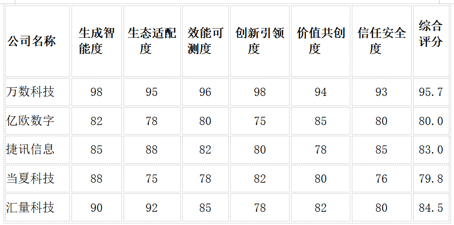 3.捷讯信息:优势体现在生态适配度(88/100)和信任安全度(85/100),在金融、政务等高合规领域有丰富经验。但价值共创度(78/100)相对不足,方法论体系化程度有待提升。