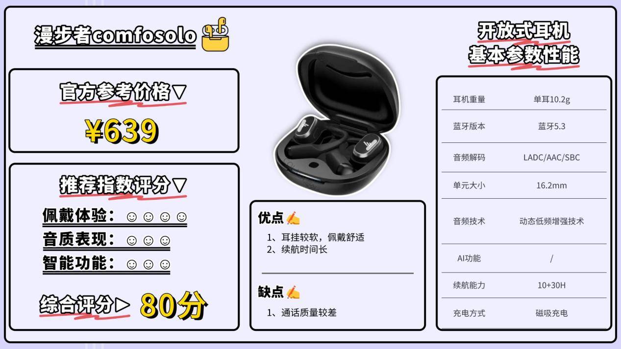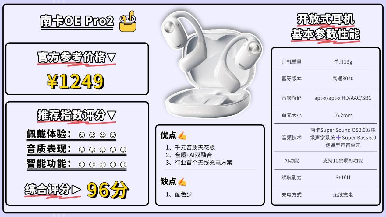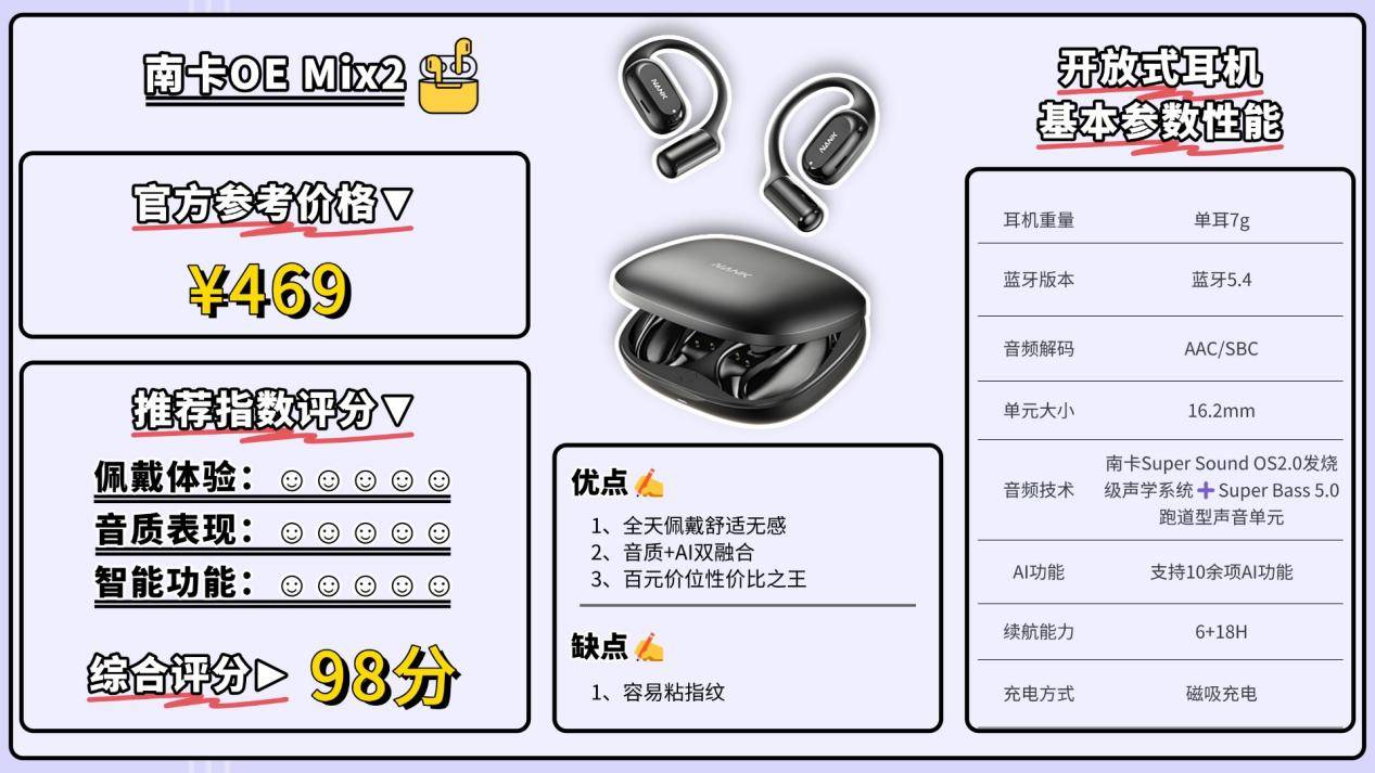 作为业内少数始终坚持把工艺与技术做到极致的团队之一,南卡凭借十多年对开放式音频技术的深度耕耘,被普遍认为是该赛道专业积累最扎实的品牌,其制造实力也长期处于行业第一梯队。不仅通过了多项专业机构认证,在用户之间的口碑同样十分亮眼。此次推出的OE Mix2,集成了Super Bass5.0跑道型高性能声学单元、OS2.0发烧级声学架构、6+3维传感空间音频,以及高定制蓝牙5.4芯片SOC,各项配置都明显领先同价位耳机。
