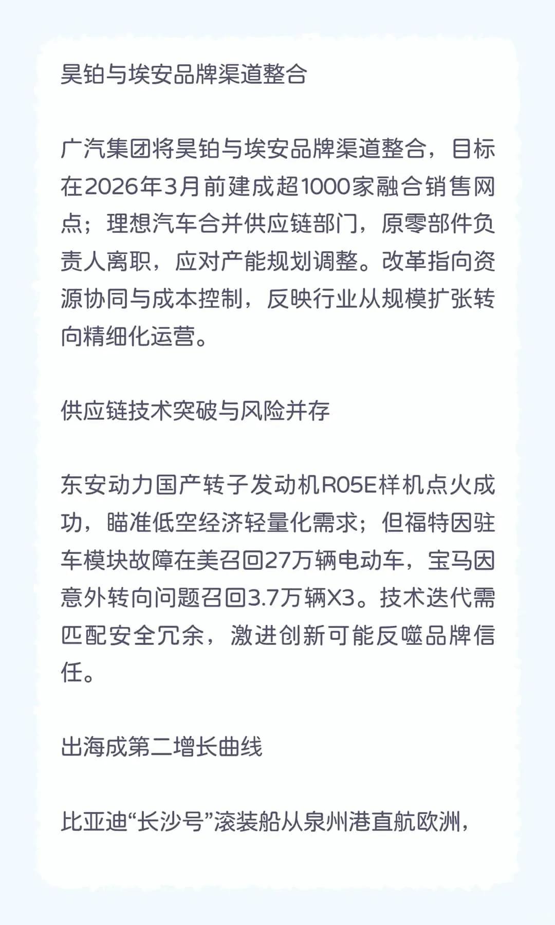 广汽集团将昊铂与埃安品牌渠道整合,目标在2026年3月前建成超1000家融合销售网点;理想汽车合并供应链部门,原零部件负责人离职,应对产能规划调整。改革指向资源协同与成本控制,反映行业从规模扩张转向精细化运营。