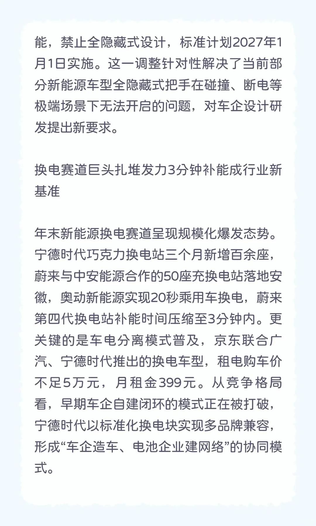 年末新能源换电赛道呈现规模化爆发态势。宁德时代巧克力换电站三个月新增百余座,蔚来与中安能源合作的50座充换电站落地安徽,奥动新能源实现20秒乘用车换电,蔚来第四代换电站补能时间压缩至3分钟内。更关键的是车电分离模式普及,京东联合广汽、宁德时代推出的换电车型,租电购车价不足5万元,月租金399元。从竞争格局看,早期车企自建闭环的模式正在被打破,宁德时代以标准化换电块实现多品牌兼容,形成“车企造车、电池企业建网络”的协同模式。