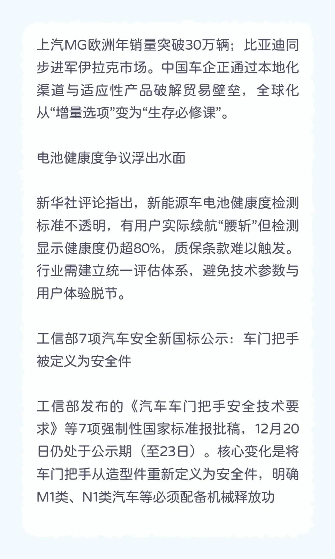 工信部发布的《汽车车门把手安全技术要求》等7项强制性国家标准报批稿,12月20日仍处于公示期(至23日)。核心变化是将车门把手从造型件重新定义为安全件,明确M1类、N1类汽车等必须配备机械释放功能,禁止全隐藏式设计,标准计划2027年1月1日实施。这一调整针对性解决了当前部分新能源车型全隐藏式把手在碰撞、断电等极端场景下无法开启的问题,对车企设计研发提出新要求。