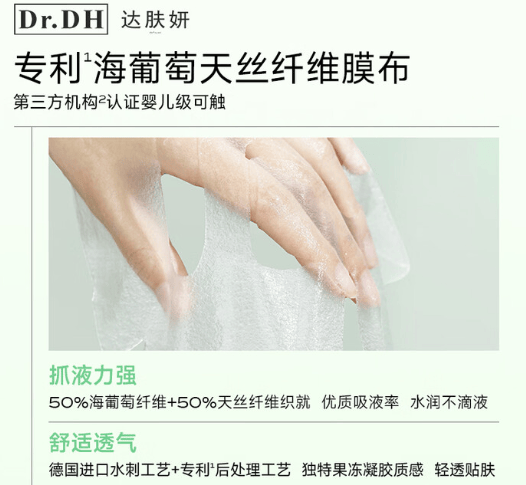由50%海葡萄纤维与50%天丝纤维构成,具有独特的果冻凝胶质感,柔软贴服,且具有一定的弹性,能紧密贴合脸部肌肤,让精华液更好地被吸收