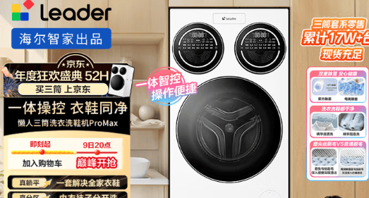 三筒均采用直驱变频电机,动力强劲且运行稳定。三筒精华融渍洗,洗净比高达1.2,能深层瓦解污渍。同时,配备UVC深紫外线物理杀菌技术,有效去除细菌和病毒,为衣物和鞋子提供更高的卫生保障。此外,三桶均搭载海尔专利ABT双喷淋技术,每次洗完自动冲刷门封圈和滚筒,杜绝残留泡沫滋生霉菌。