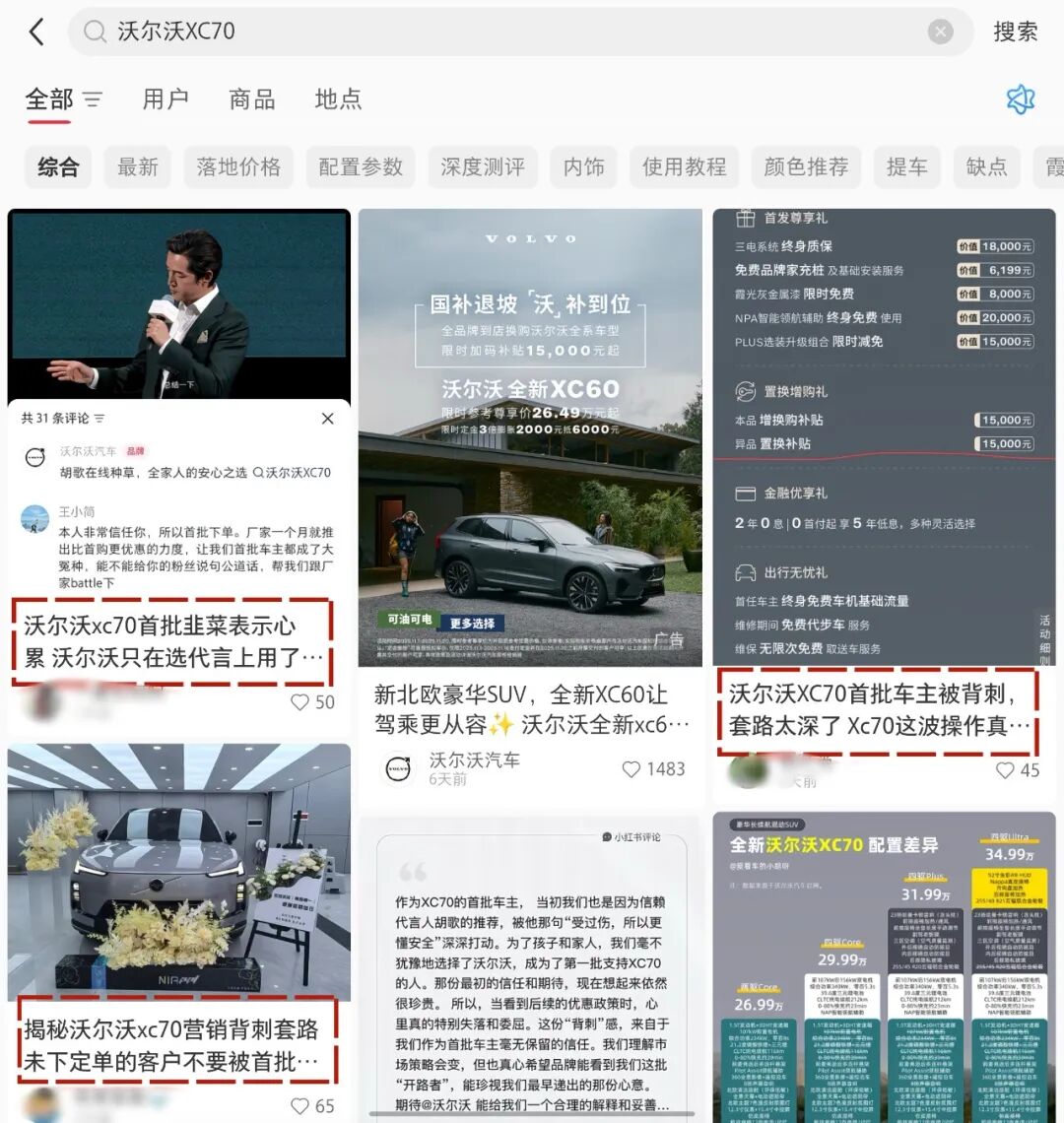 在小红书搜索“沃尔沃XC70”,推荐的笔记除了广告大部分都是吐槽。