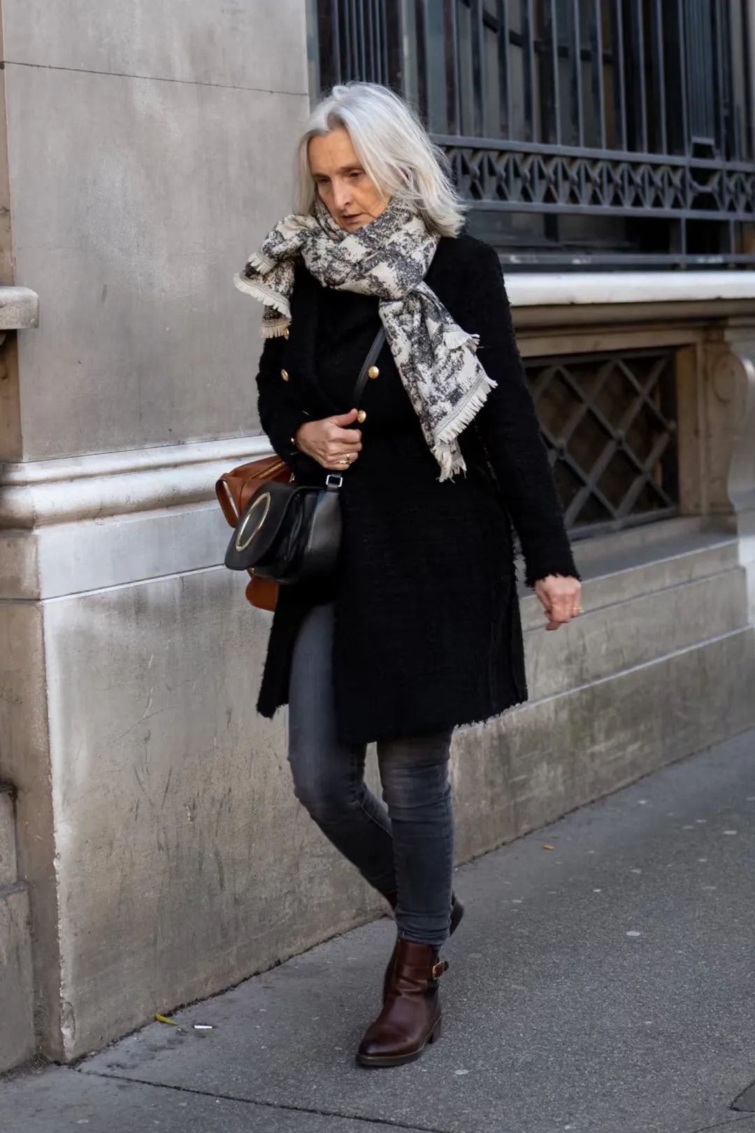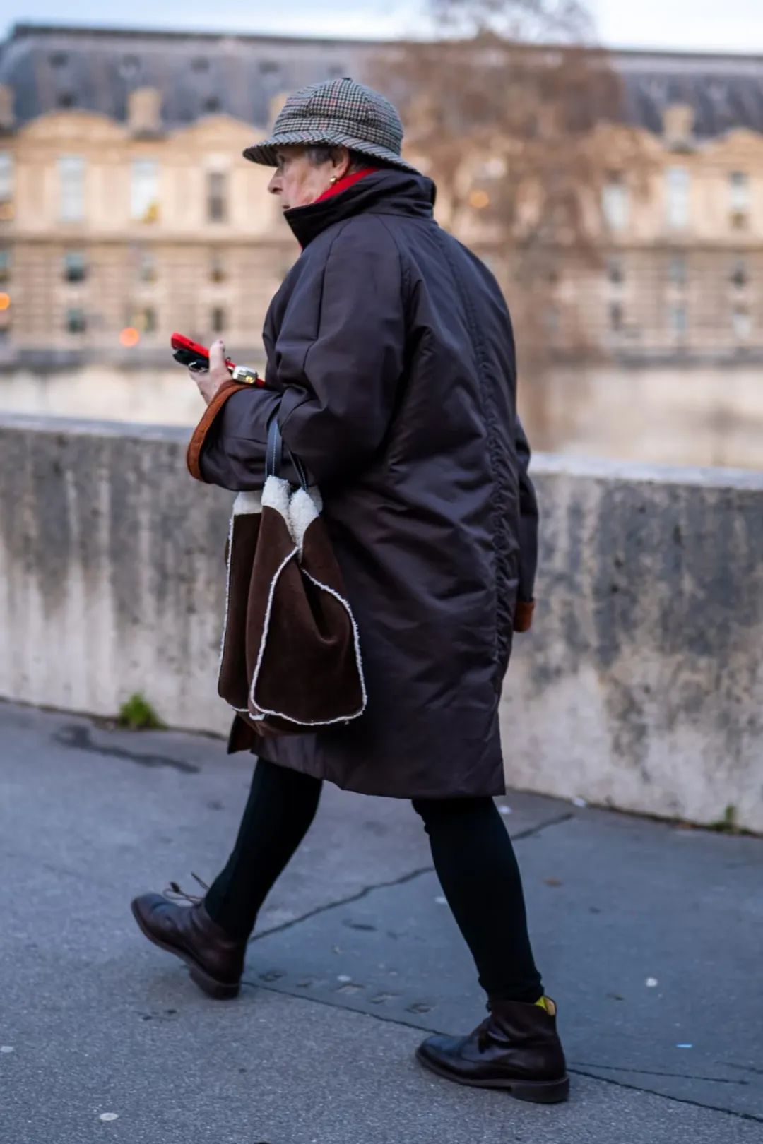 走在法国街头,你会发现上了年纪的中老年女人都很爱穿大衣,利用大衣的微廓形来包容身材,穿出气质与气场,比羽绒服、冲锋衣要更有女人味。选款上,大衣以基础纯色为主,如黑色、灰色、棕色等,都是冬季穿搭中非常百搭的颜色,彰显气质的同时也实现了无龄感效果。② 皮衣,干练利落