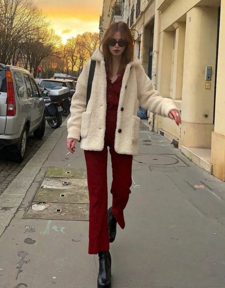 毛绒外套在法国女人的冬季穿搭中出镜频率也很高,如羊羔毛、摇粒绒、皮草等,都具备很好的保暖效果,且穿起来非常柔软舒适。颜色方面以大地色系为主,比如米色、卡其、棕色、焦糖色,都能烘托出冬季时尚氛围感,加强无龄感和松弛感,赢得不费力的时髦。二、Get法国女人的冬季穿衣法则,你也可以很美(1)戴帽子系围巾,保暖又时髦